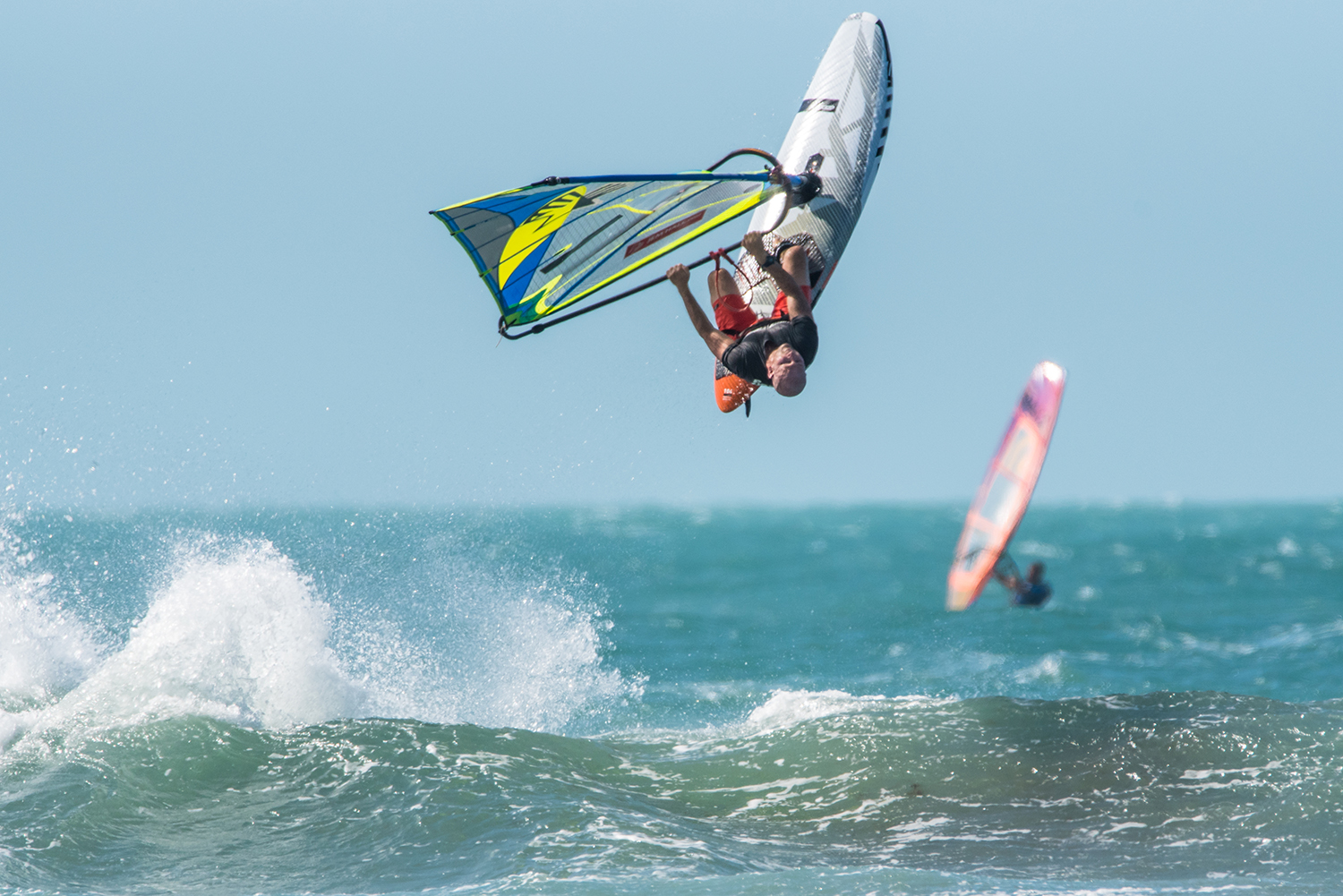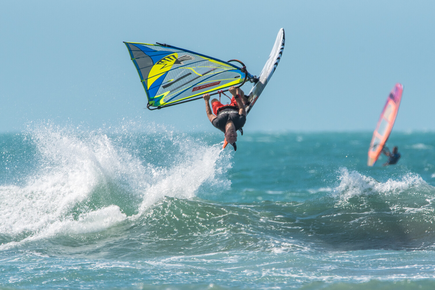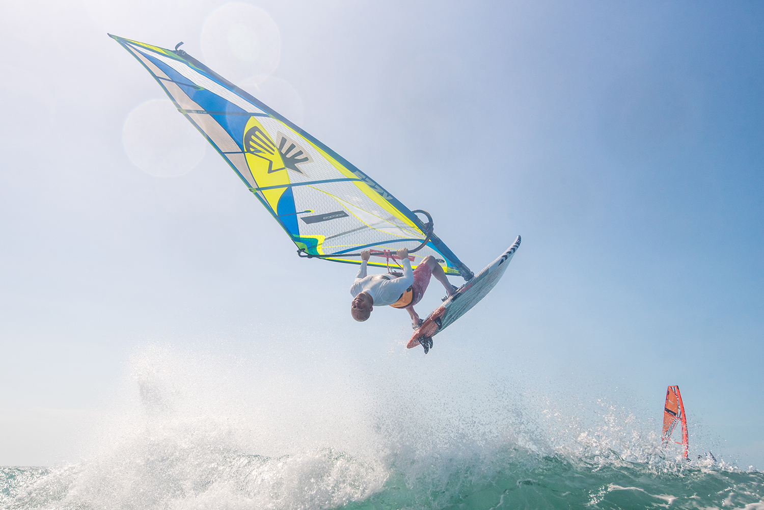 Throw your hips at the sail and keep your arms relatively straight. You need to really throw your head back and look back at the beach, aim to actually spot something you can see as this can really both help you and orientate you. Keep your eyes open as the sky flashes past you. Your legs should position the board in the air with the back leg pulling in and the front leg subtly pushing the nose off the wind to ensure the nose keeps across the wind – i.e. that good old scissoring technique.