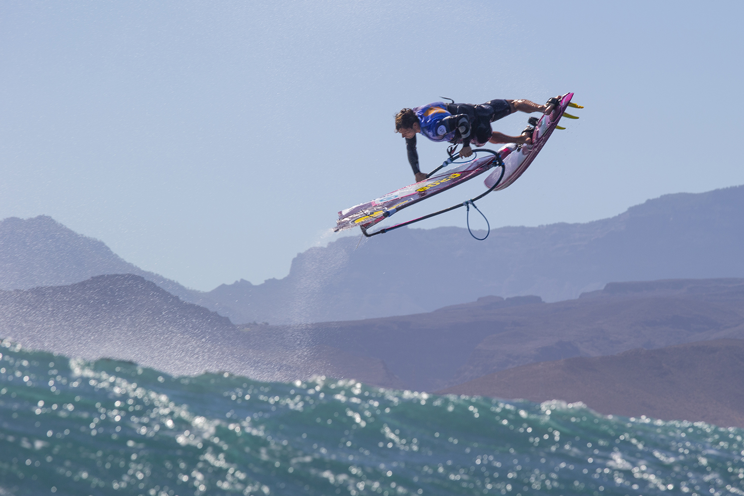 Jumping and wave riding techniques change quite a bit when the wind turns from side-shore to onshore. In side-shore conditions you head out at a right angle from the beach, which means the waves will come right at you and you don´t need to change your direction to use the wave as a ramp. In comparison, when it’s more onshore you are moving parallel to the swell, rather than actually crossing it. Therefore, in order to take off and use the wave as a kicker you need to carve into the wind. This necessity will make some jumps a lot harder than others. Back loops and tabletops for example work fine in onshore conditions, as you would take off and jump into the wind anyway. With back loops in onshore a popular problem is that you either over or under rotate. You will need to actively jump into the wind and initiate the rotation in order to not under rotate. Once you have passed the highest point however, you really need to slow the rotation down and control the landing. Therefore, it is very important to compress and stay close to the equipment. Don´t lose your body tension and faith! Forward loops and push loops can be a little tricky in onshore conditions. For push loops, you want a decent ramp that allows you to gain some height so your mast won´t get stuck in the water mid rotation; that is crucial in onshore conditions. For forward loops you don´t want to take off too much into the wind, as this will make the rotation a little strange and difficult. If you want to stall your forward though, you might have to take off after carving into the wind. Then while in the air, compress at the highest point and point the nose of the board away from the wind and towards the beach before you initiate the rotation. While in side-shore conditions you often get away with some technique flaws, in onshore conditions most of the time you will get punished for them straight away. So always remember the important basics of each trick. For forward loops, move the back hand further back, look back over your shoulder and compress.