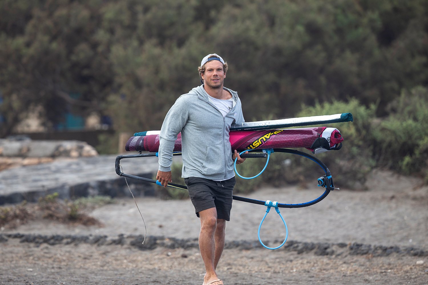 Chaotically crumbling onshore waves, patchy wind and lots of current is not exactly the material that our wave riding dreams are made of. However, it represents the conditions that most European sailors deal with most of the time, especially in small stretches of water where groundswells can´t exist. Onshore or side-onshore wind is, after all, the best guarantee for at least some waves. Yet, onshore wind often goes hand in hand with a set of difficulties that the sailor will have to face. First of all, the wave patterns are very unorganized and chaotic. Waves break all over the spot, there are hardly any clearly distinguishable sets coming in and there is no defined impact zone. Because the wind literally pushes the waves towards the shore, the wave’s top breaks earlier than usual, which results in a rather mushy and gutless wave face. In onshore conditions the wind is normally patchier and lighter close to the shore than further out at sea. This is due to obstacles on land like buildings, trees or cliffs, which hinder the wind from passing through without resistance (in German we call this phenomenon Luvstau). Furthermore, all the water that is being pushed towards the shore has to go somewhere. The back stream often creates strong currents, which makes it even harder to get going. Nonetheless, not everything about onshore is bad. In fact, some manoeuvres become easier and lots of onshore practice can refine your sailing technique a lot. To successfully master all the challenges there are certain equipment choices, trims and techniques that will make your life a lot easier and will enable you to maximize your sailing potential and joy on the water.