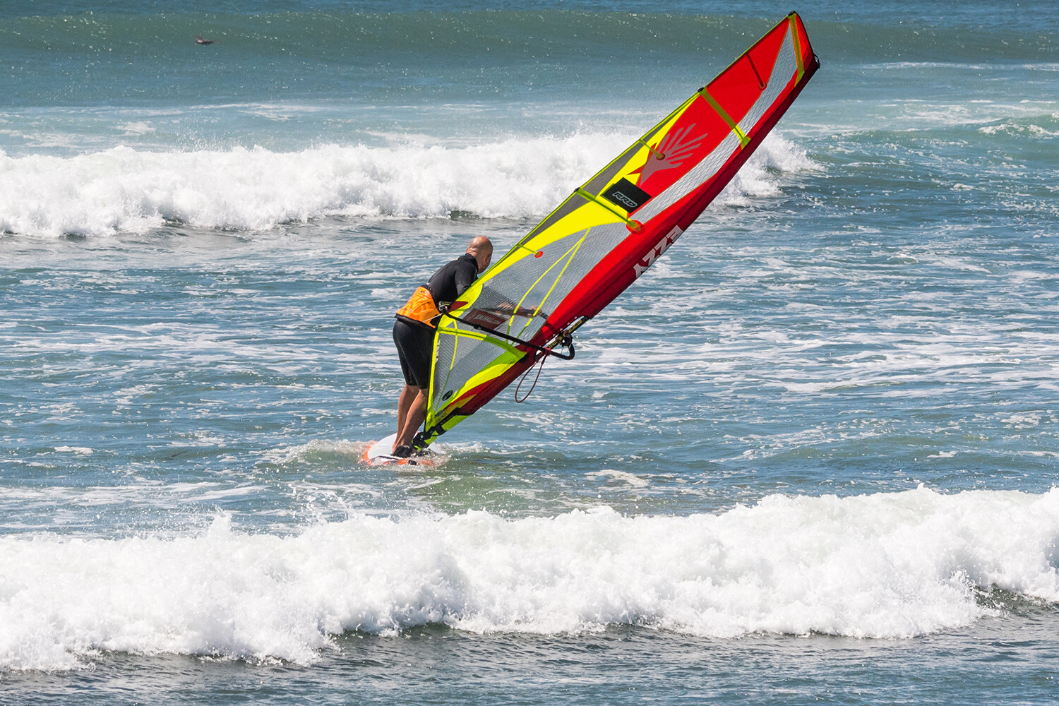 - Slide the back hand down the boom and put pressure on it to start rotating the sail, this will steer the board off the wind, so it is on the best course to rotate the rig.