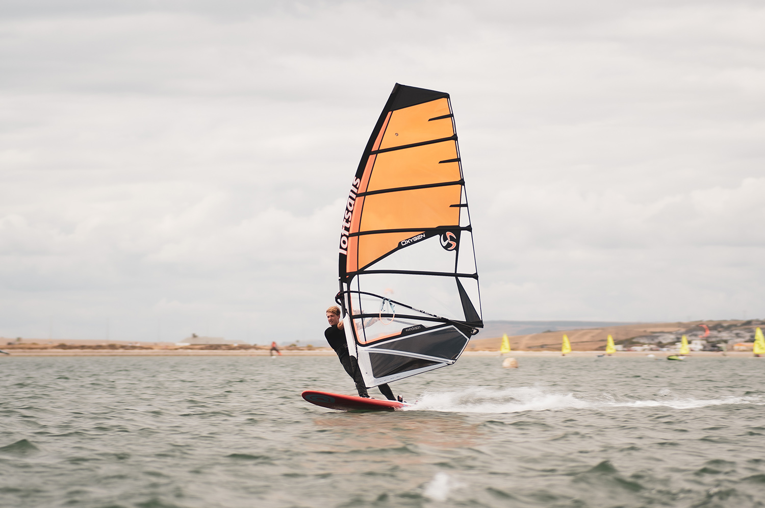 Loftsails transitioned to a multiple year lifecycle last year, this no-cam freerace Oxygen being noted as current for a total of three years in the brand’s literature, up to 2023. Available in green HD construction, using x-ply throughout its panels, it is tested here in its standard setup, with orange 4mil bi-ply body panels above its 5mil monofilm window, and 5mil biaxial x-ply luff, clew and foot panels. Build quality is second to none, as we have come to expect from the Loftsails brand, with its familiar double Dacron head panel, tubed battens, durable IYU250 luff tube material and fully opening moulded tack fairing. Rigged here on the brand’s recommended 75% Vision mast, it was tested on an SDM (whilst also compatible on an RDM) and set with easily the most luff curve of all the sails on test here, the significant downhaul tension directed by the ‘trim diamond’ in the upper panel. Setting flat at rest, particularly above the boom, with just the two lower battens retaining any rotation, there’s plenty of looseness along the length of the leech and some considerable skin tension through the leading edge. Available in a total of ten sizes, from 4.6m right up to 9.5m, it was tested last year in the HD 7.0m version, so we were interested to see how this larger sizing faired, transitioning from a six to seven batten layout.