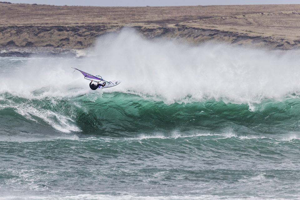 1.30pm: Finn has to come off the water for a work zoom call…doh… but not to worry his wife Katie is subbed on to take over on the water. Katie is on a 3.7m and looked maxed out on the wave.