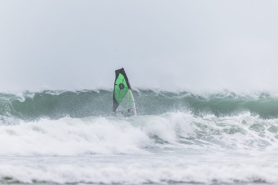 I sailed a total of five heats, on a 3.8m sail and the faithful 92 Twin (ditching the 75 after heat 1), doing plenty of swimming and not getting many scoring waves. But I got lucky on a couple that stayed open for a few turns and was surprised and stoked to do just enough to finish in 6th place and get in the prizes!! A very nice Boom Windsurfing hoodie and Finistere hat and socks. Ian Gibson, who had driven from Scotland, won my last heat and shortly afterwards won the 4-man final too! He sailed a blinder, including a superb long, 8.5 scoring wave…