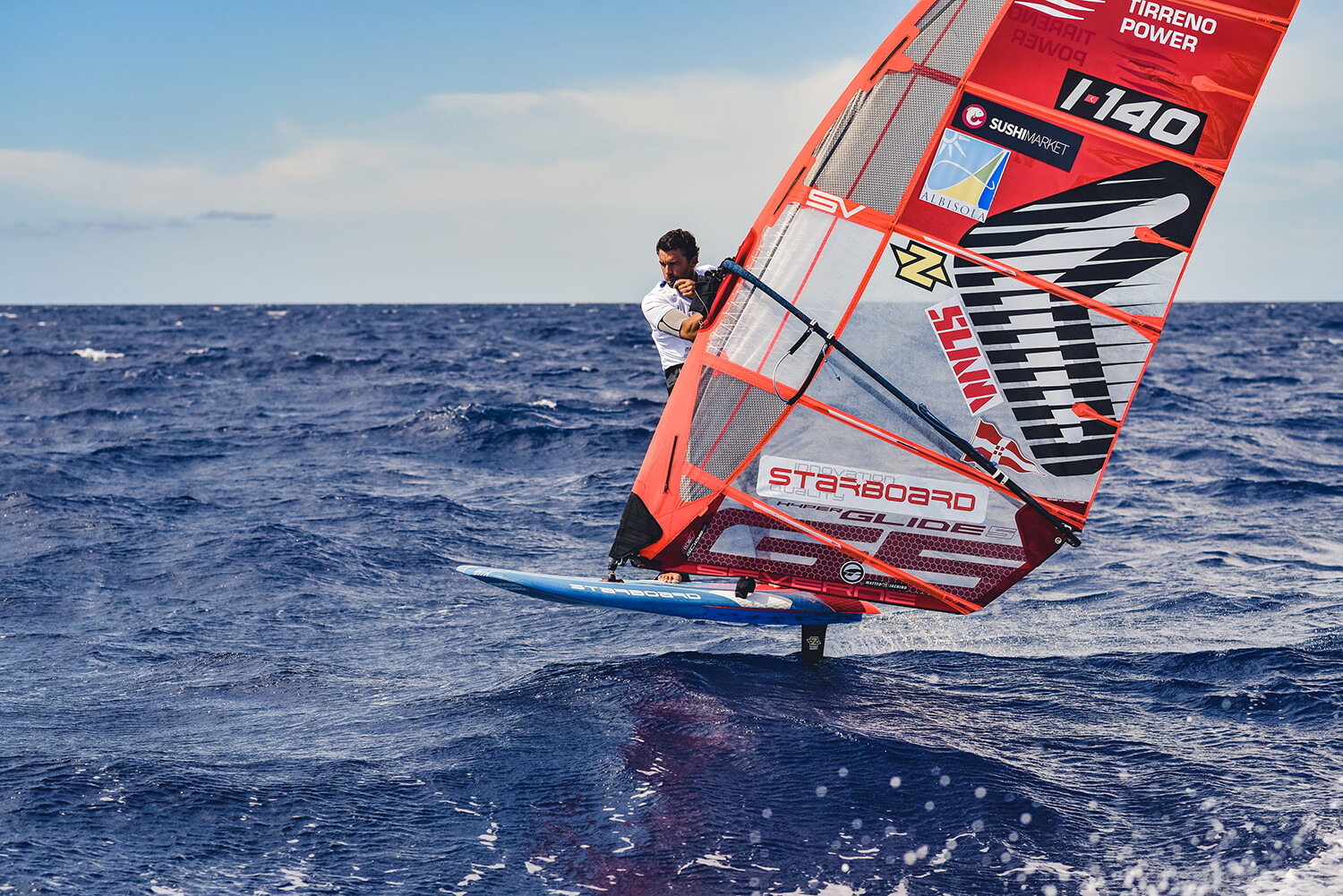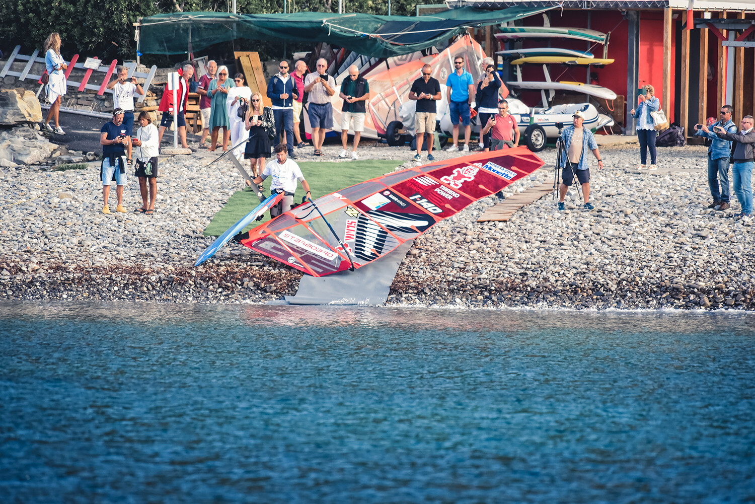 With everything ready after nine months of preparation, the waiting period started slow with hot summer days and light breezes. Around the 2nd of September we saw something was moving for the 7/8/9 September. Getting closer it was clear that the 8th of September would be the day. We had to make the official call so that the team could gather together and this was done on the 7th September in the morning. That day was stressful, checking the ever changing forecasts and preparing my foils sails and boards. I prepared my 5.5 litre CamelBak with minerals and carbs, and energy bars tucked in also. The 8 of us at 5 a.m. met and drove to Imperia, a city located one hour towards France from my place. We got on the beach and the wind was super light. At 8:30 a.m. the crossing started. It took me forty long minutes to get out into the open sea to finally get the west wind that was already blowing on the outside. From there I had four magic hours flying on starboard tack towards Corsica with an average speed of 24 knots. There was a magic moment in the middle for one hour when I was not able to see Italy or Corsica. The wind was perfect around 20 knots, the waves smooth around 1/1.5 metres, and everything was just insanely good. Then I finally began to see Corsica and after 140 km from the start, I had just eight miles to get to Giraglia island, the finishing point that is located on the north of Corsica. But then the wind died. I had been sailing at that point for 5 hours and I was tired and hot in my 3/2 mm wetsuit. I could fly on the foil now and then, but it took me one hour and a half more to do the last little part. The island at that point looked incredibly close, but impossible to reach at the same time. After 6 hours and 3 minutes and 161 km I made it and finally scrambled ashore on Corsica, climbing over some rocks. I felt exhausted and happy at the same time. I had made it!