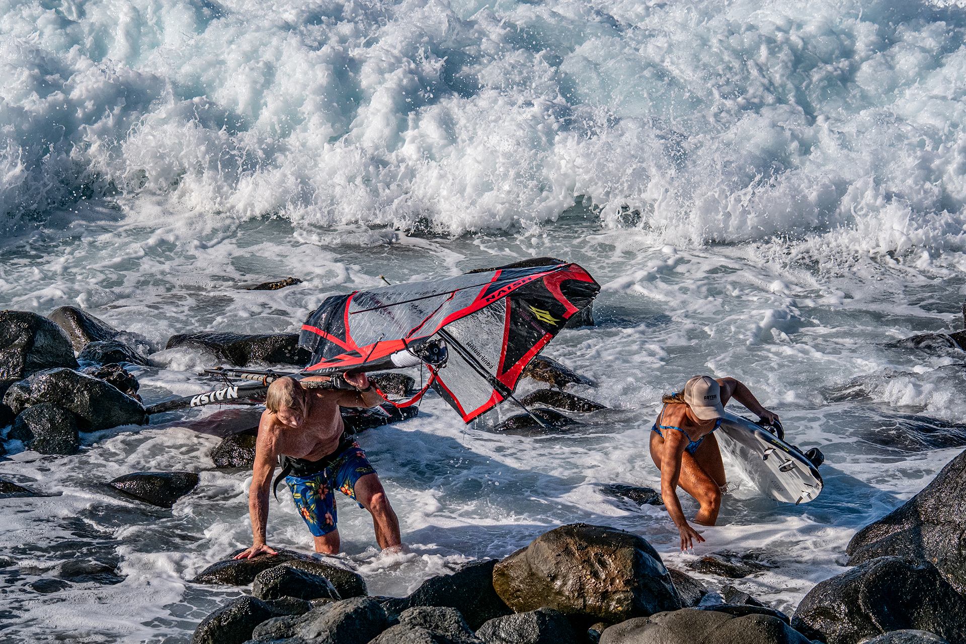 As he launched, the already dropping wind got even lighter and he was wobbling through the current as a huge set rolled through the channel. He held on to the gear through the first couple, but it was ultimately ripped from his hands and landed in the rocks where it eventually came to rest, with only the boom still in one piece – everything else destroyed!
