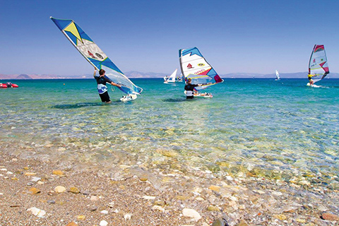 Wind Type: Meltemi – regular afternoon thermal. A shallow, wind protected area near centre allows beginners safe starts; further out stronger wind, increased wind chop and sometimes ramps up to 2m.