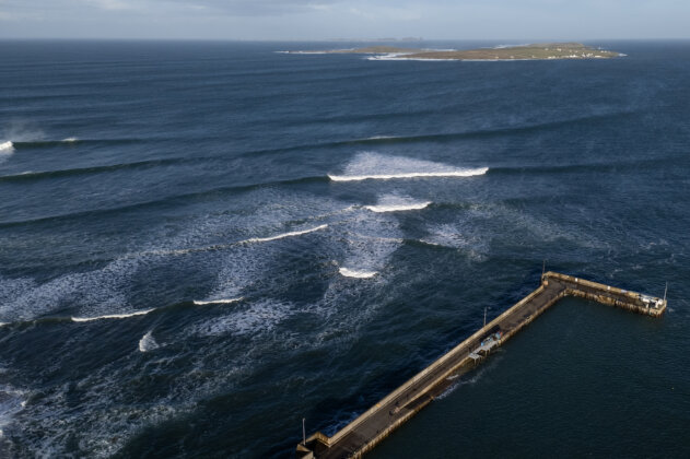 The forecast promised a 5m swell at 17 seconds, so at least the waves should be firing. We pull up for the obligatory spot check and reef photo, and suddenly everything looks much better. Logo-to-mast-high waves are peeling beautifully across the bay. There is wind…gusty, cross-offshore, but definitely there.
