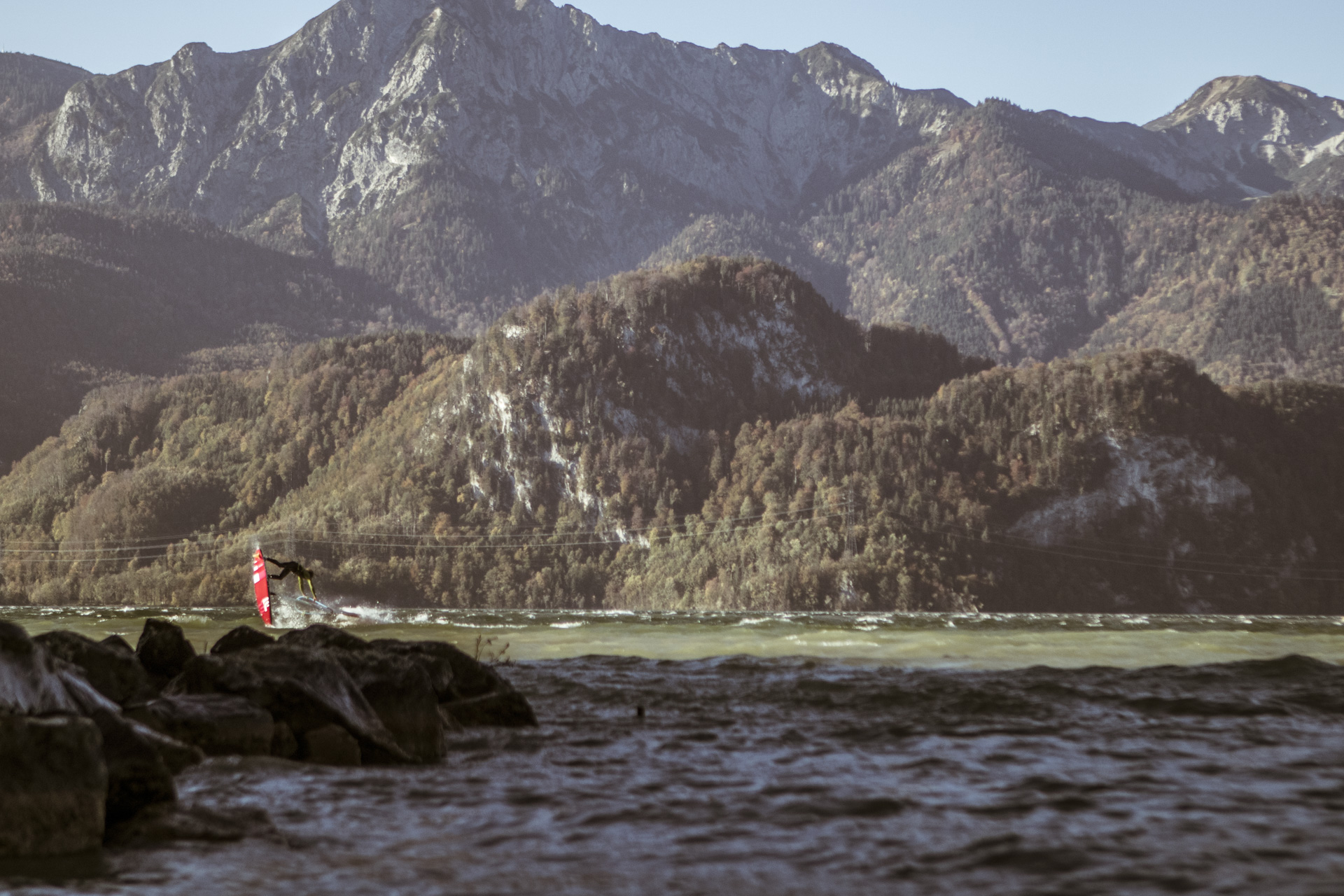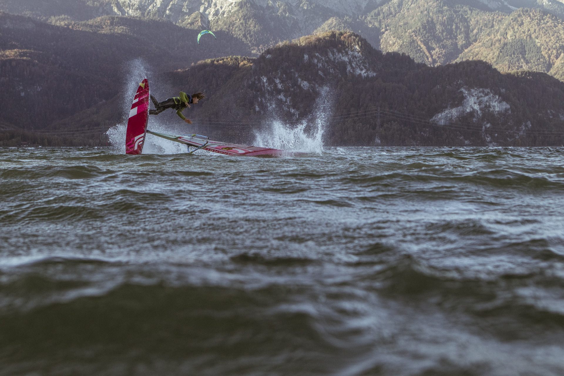 _MG_6796When I look at photos in a surf magazine I always see blue water, blue-bird sky and sandy beaches – postcard kitsch. So the idea came up to go another way and work with flash. After a few thoughts, location scouts and mood sketches, the choice fell on the beautiful Kochelsee, a.k.a Lake Kochel, located 70 kilometres south of Munich on the edge of the Bavarian Alps. Nestled between Herzogstand, Jochberg and Heimgarten was the chosen spot to score 20 knot plus winds.