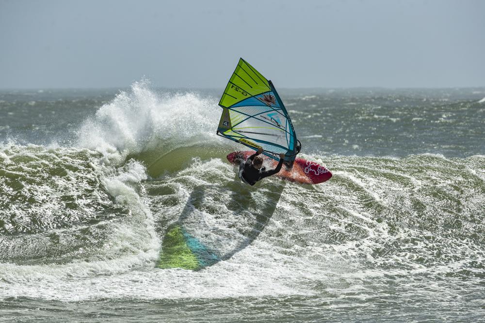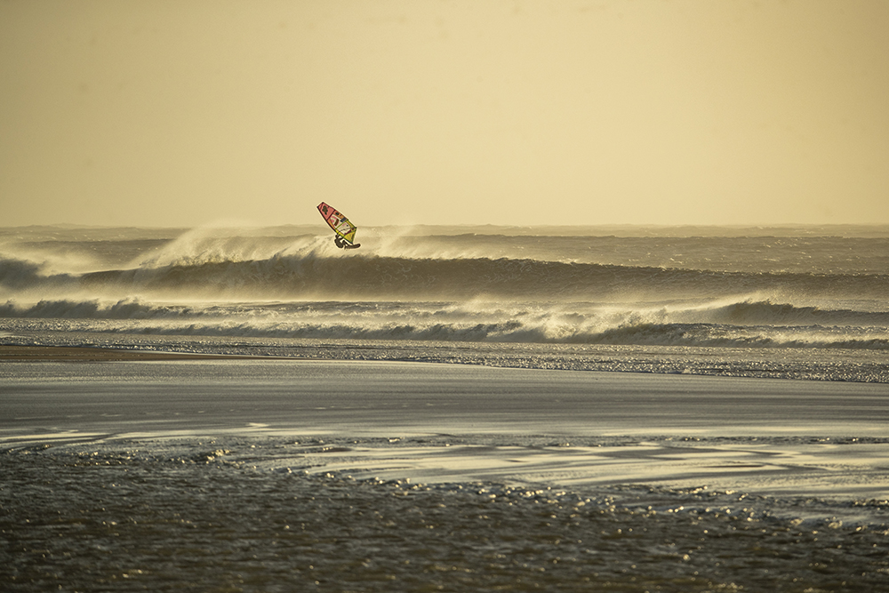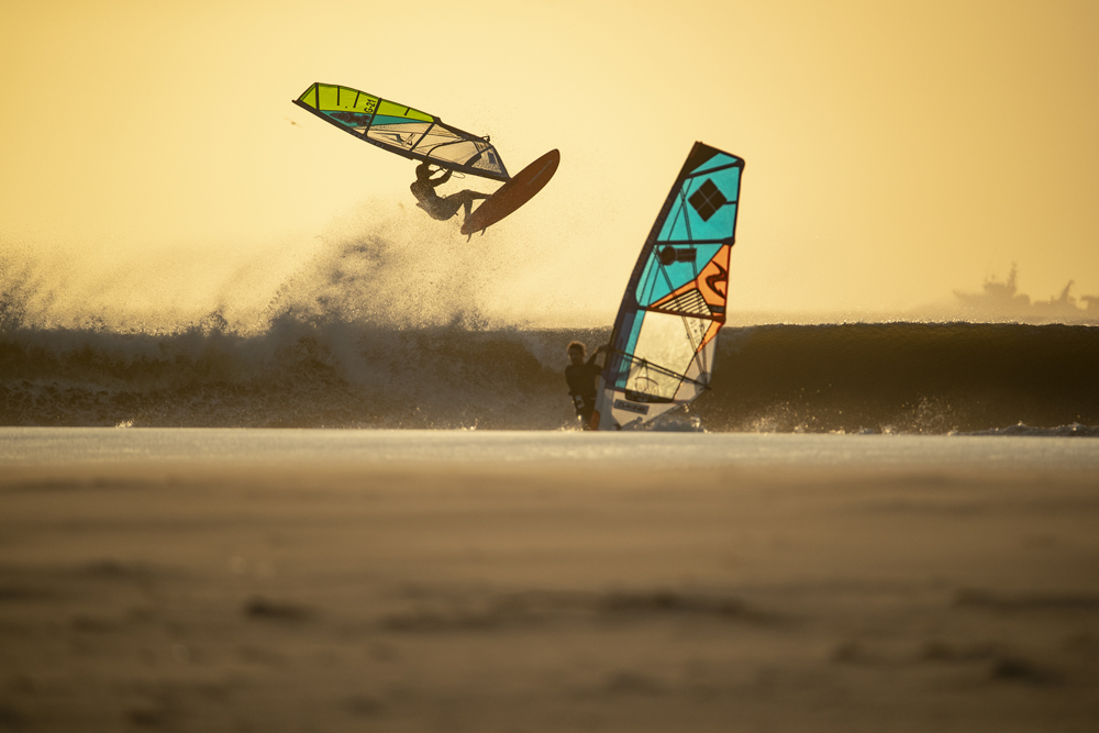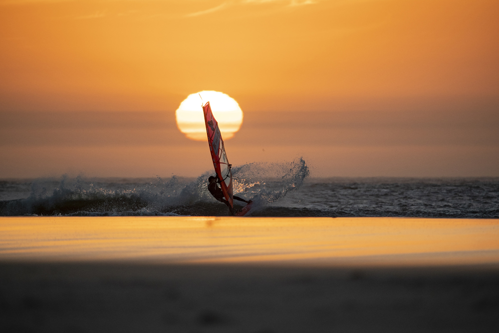 On the fourth day we arrive on a beach again deserted, the swell has dropped but the vision is just beautiful. The perfect-looking head-high waves look so fun, the wind is a little lighter than the previous days, we all have a huge smile and eyes that shine: “that’s what windsurfer’s paradise must look like,” says Flo, summarizing more or less what we are all thinking. Once again, we sail until the night, Leon throws powerful turns and manages to ride a wave for 2 minutes and 45 seconds. Flo lands super clean goiters, Camille and I really enjoy the lighter winds. Pierre is in the water with us to take pictures, everyone is happy, the seals share some waves with us. The sand is flying gently on the beach, everything seems in balance – land, sea, seals, windsurfers, and a beautiful sunset to close the party.