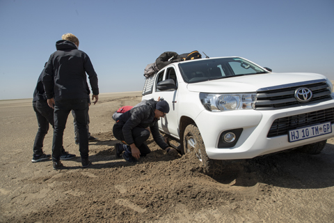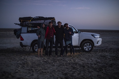 A motivated photographer, two assiduous cameramen and four riders excited to be the first ones to windsurf this wave. An opportunity that none of us would want to miss. After a couple of days the mission is planned, plane tickets are bought, vehicles and accommodation reserved. The die is cast. And yet we continue to doubt. A few days later we land in Windhoek, everything is dry around us, we can only see pebbles, a lot of sand, the shrubs are not even green. We drive west for half a day, surrounded by sand. Sometimes we go through a village… and then come the dunes, at the top of which the sand begins to fly. Finally, something that seems to move.