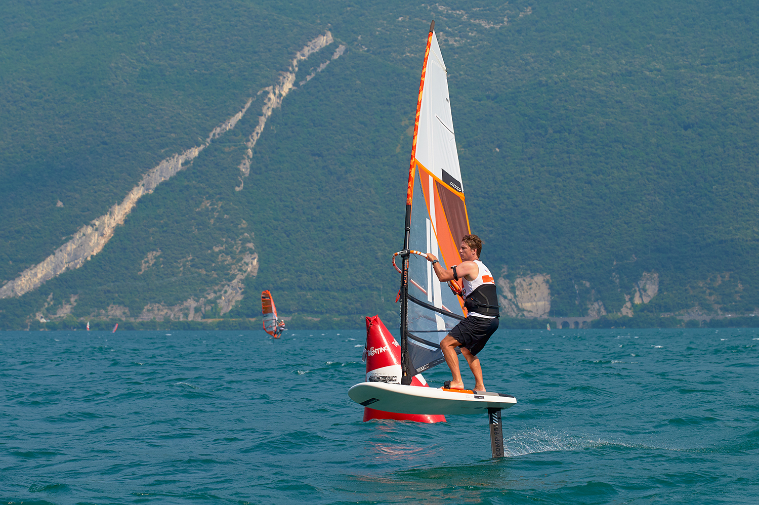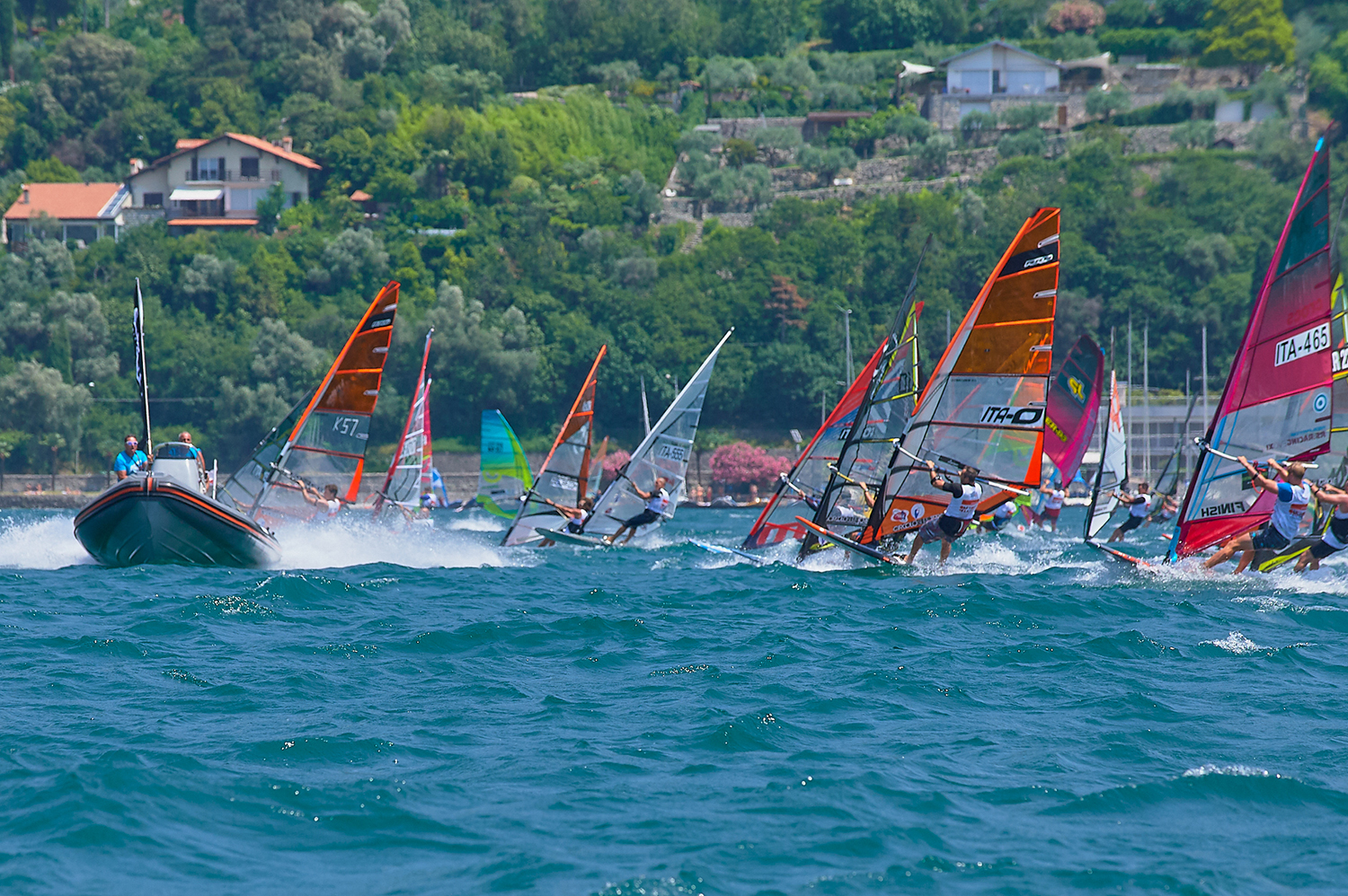 The One Hour event is sponsored by RRD and is housed in the legendary Circolo Surf Torbole windsurf centre at the north end of the lake. This is base camp to many of the world’s RS:X teams, as well as the official race centre for just about every windsurf race event held on the lake. The briefing was set for 11 a.m. and the rules were explained in both English and Italian, with everything set for a 1 p.m. start. The only thing missing was the wind! The event coincided with a massive heatwave. The day before was a staggering 40+ degrees, and with Windguru forecasting zero wind, any hopes of wind were pretty low. I was not really complaining too much at this point, as my gear still hadn’t turned up! It had been lost on the flight, and whilst I had organised some backup gear, I hadn’t actually collected any of it yet. All the locals said there was almost no chance of wind and as my family were with me for a change I took advantage of the calm to hang at the hotel pool a bit. Suddenly however the trees started to move and very unexpectedly the famous Garda wind machine had decided to ignore all the forecasts and switch itself on, providing a steady 15 knots on the racecourse. Suddenly it was panic stations all round as everyone scrambled to prepare.