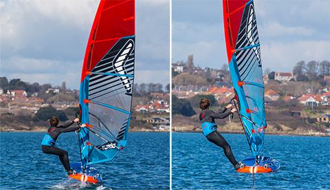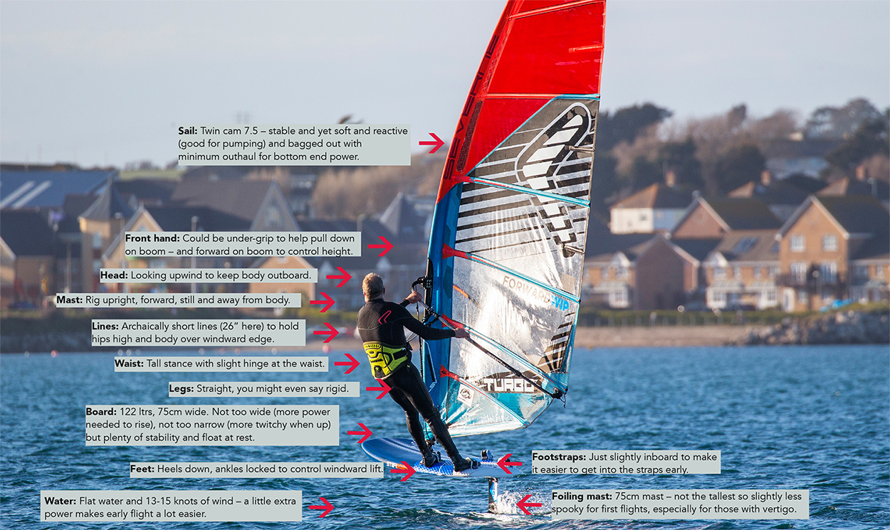 The essentials of taking off are holding the rig still and away from you on extended arms – and then getting straight into the straps and pumping the foil. Note as soon as the windward edge lifts, Sam straightens up and locks out.
