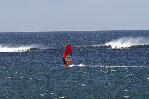 Most of the common questions like, why can’t you catch more waves; why do the ones you get not do much etc., can be answered by getting an overview of the sailing spot. Here is one of my favourites. To the left you can see the wave peaking on the reef. But unless it’s very big it doesn’t actually break and flattens off into deep water, to leave you with one of those ‘where did that go?’ moments. Further inshore to the left there’s a gap between the peaks where the rip runs out. The water is choppy and waves rarely break there with any meaning. All the waves inshore are reforms, which at this state of tide are just collapsing on the banks and not offering much joy – so there’s no point coming right inshore. Further out where the sailor is taking off, the set wave is long and peeling nicely. More than that, it’s a beautiful view!