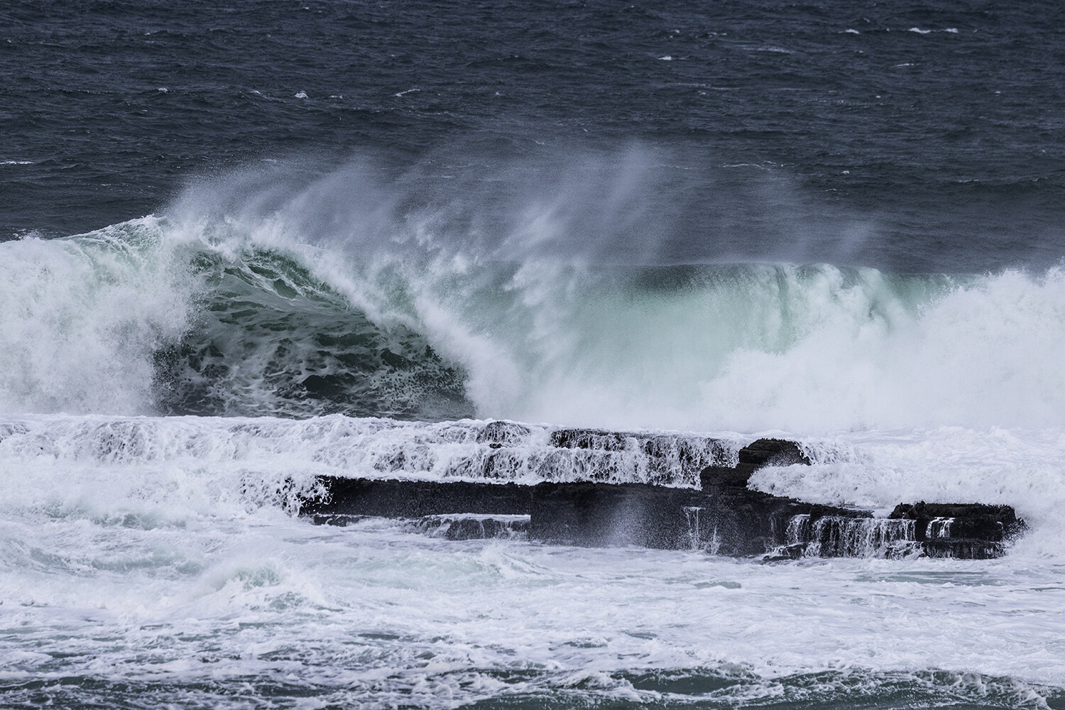 Leon was keen to give it a go, plus there was Leky and Megan Gayda, as well as a bunch of locals rigging down at the harbour, who were also up for a big wave session. One way or another it was going to be an interesting afternoon. I felt like I was in the right place at least. I had never shot windsurfing at this break before, so I was interested to see how the setup works, even if it wasn’t the epic day for it. The crew had organised a jet ski for safety cover, which is essential at Mullaghmore, as it truly is a wave of consequence, so it can easily inflict some real damage, if not even worse. After sailing up from the harbour, the session was soon underway, and I started to get the gist of how this mega heavy slab works. The one place you absolutely don’t want to be at Mullaghmore is too deep. There is a spot where this wave hits a slab of Irish reef and properly detonates into a monster barrel on its day. If you are too deep here… it is simply game over.