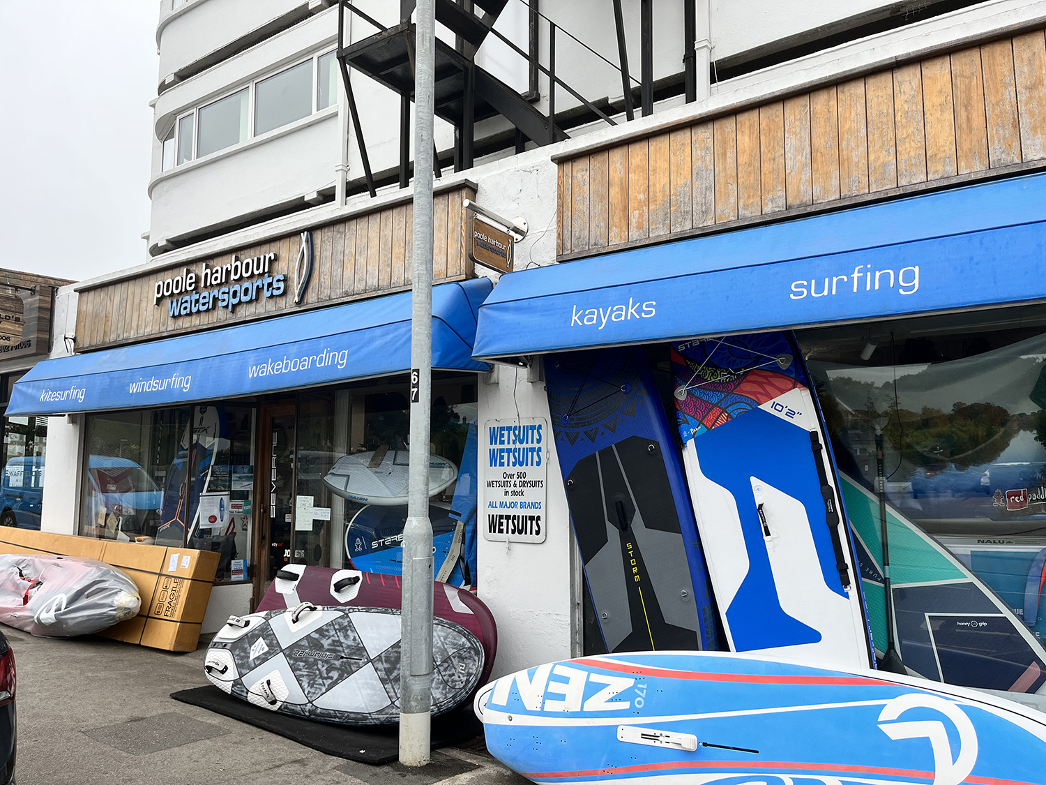 The oldest windsurfing shop is Poole Harbour Watersports, who are Starboard / Severne dealers and also do hire and tuition, then there is H2O Sports who are the Fanatic/ Duotone guys. There are also lots of surf shops for clothing and flips flops, such as Fluid which is on the harbour at the Sandbanks end.”