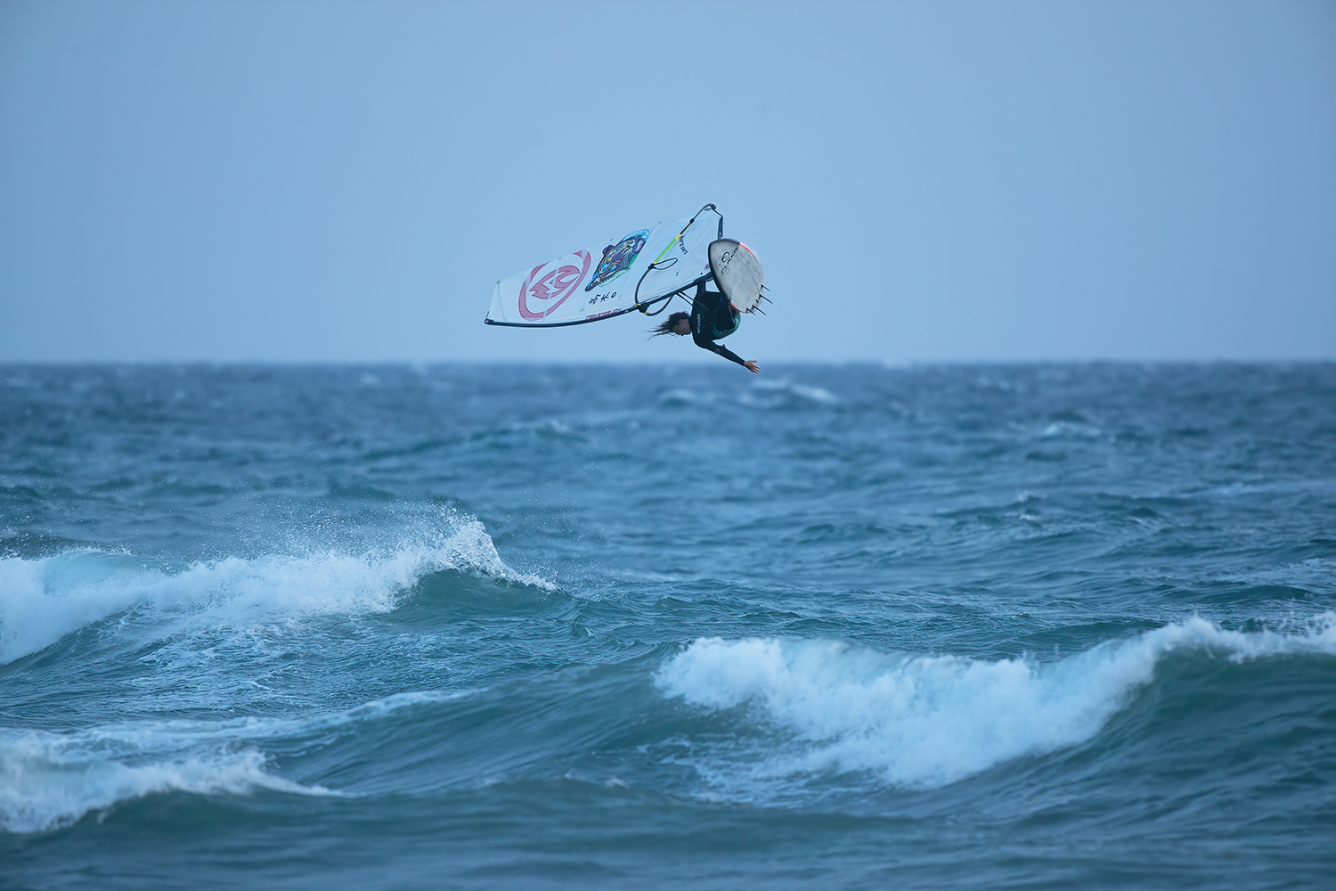 A word about my own equipment, as it compares to others. I ride, generally, the same gear wherever I go. Partly, that is because if I need wildly different gear for a location, I am probably not seriously considering going there; though I do admit that mentality is very limited. I hope to change it this season, venturing outside my comfort zone, perhaps to Sylt this year! Already I have worked with Flikka to develop a board for smaller, less powerful surf; perfect for the conditions we had! This is a board that I would still enjoy riding, not just something created out of necessity for events. I don’t really value utility as much as other pros, you can see that in how my quiver of sails and boards is often smaller than that of others. Anyways, I need fun to feel engaged, and I’m really happy that I was able to get a tool that’s both fun and effective from Flikka! It was ideal for a day just like what we had in Omaezaki. The length of this board is 215 cm, which is short even for me, and its fuller outline, combined with alternative contours, created something playful, refreshing, stylized. I actually really enjoy small wave surfing and windsurfing; I just want that fun-factor to remain constant, though it takes on a different form. Under the board were a pair of prototype quad fins from Black Project, designed for Phillip Köster. I love watching Philip sail because he’s this big guy that dances on the water like a ballerina bear. He’s so light on his feet, so sensitive and reactive. These “onshore” fins have a really springy quality that matches my style and board nicely. They’re the link I use to translate what I love to do in offshores to the onshore conditions we find on tour-stops like Omaezaki. So riding those fins gave me quite a bit of confidence to go for a Taka on a really tricky section, as well as the liveliness to stick it despite the sketchy landing. I also paired this setup with the right sail, using a 4.5 SuperFreak throughout the competition. It’s the first time I’ve used a SuperFreak in an event, though I’ve been free-sailing on them for a few years now. I am probably one of the sillier riders on tour, in terms of the things I like to do on the wave, and that freedom from convention is the primary virtue of the SuperFreak. I must’ve known, through E.S.P., that there’d be light winds, because I brought my 4.5 in to local Maui artist, Judie Vivian, to have a wonderful tiger painted on the very fabric of the sail; along with my ancestral Japanese surname: Takagi, which means “High Tree” family.