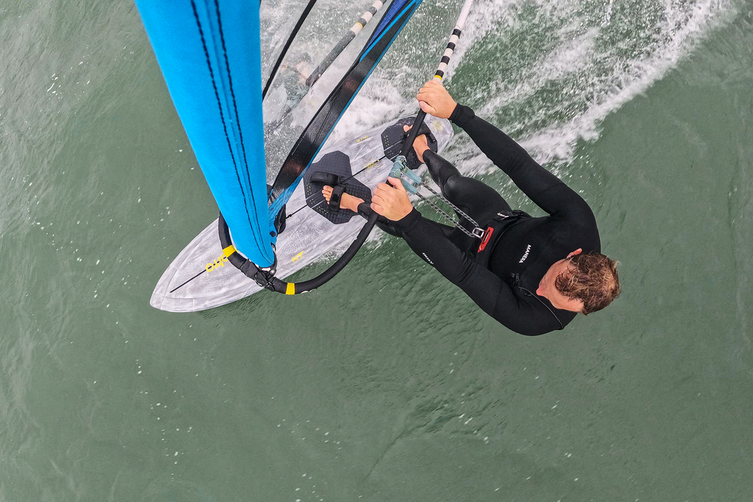 Stepping onto the Cube 6, you immediately feel like you’re on a longer board… you aren’t, but something about its outline, proportions, and where you stand makes it feel as though you are. The Cube 6 feels comfortable underfoot, and when off the plane, it sits happily and holds its ground well. Getting going on the Cube 6 is easy, with ample space behind the mast foot and a tail extension that makes moving back into the straps feel natural. The straps present themselves to you, so you don’t have to search for them. Holding speed and maintaining pace, the Cube 6 is an efficient machine, quickly accelerating to its ample top speed. Lulls are a thing of the past as the tail extension carries the load through to the next gust, and its bottom shape allows for a lower planing threshold. Transitions are nimble and very much led by the rider with the Cube 6 reacting to the slightest input when you’re back in the straps. The Cube 6 lets you pick your route out to the line-up in both onshore and more classic down-the-line conditions. Its broad planing threshold and tail extension are the Cube 6’s gift to you, allowing you to sit on the crest of a wave well in advance before it’s fully formed, or mere seconds before dropping down the face for your first committed and gouging turn. Bottom turns are smooth, locked in and controlled, while being positive with the back foot allows you to tighten up turns and go vertical at a moment’s notice – even in bolt onshore conditions, which is impressive. The Cube’s natural proportions keep the rig forward, giving the rider plenty of space to move, twist, play, and make the absolute most of the conditions on offer.