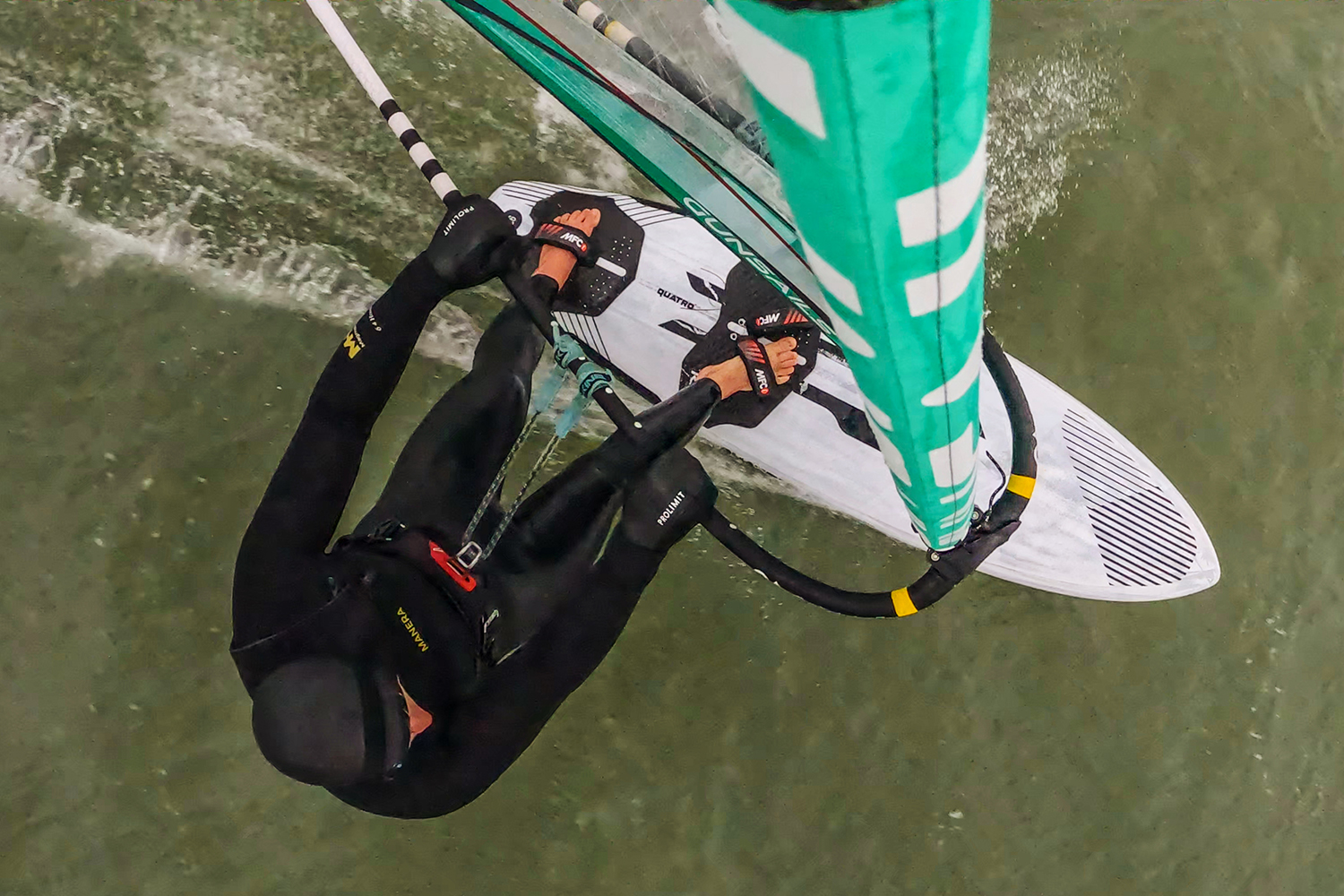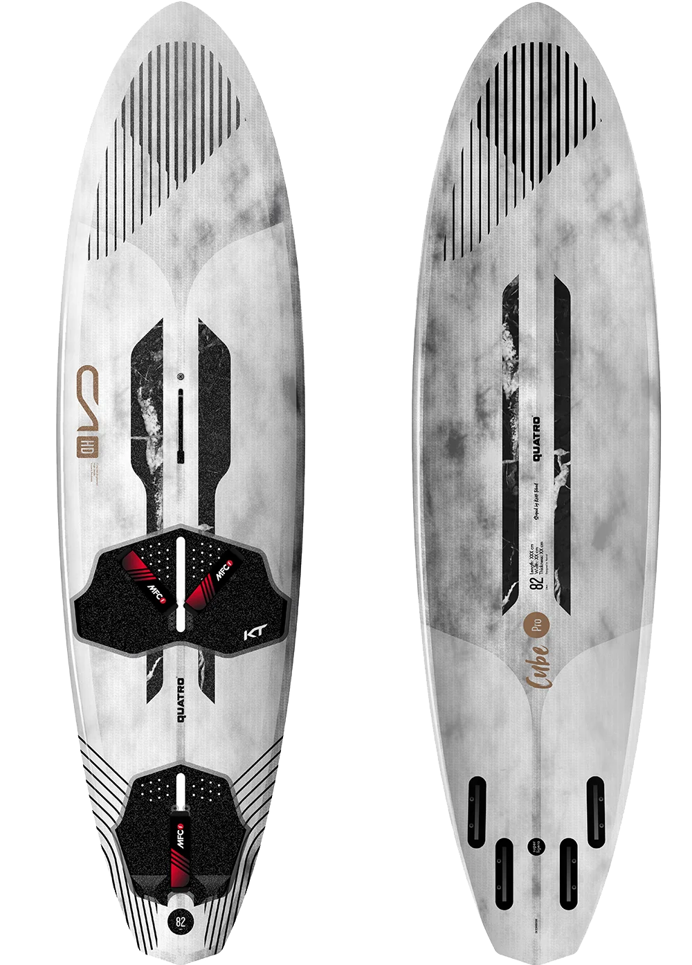 The Cube Pro feels easy right from the start, with its volume distributed smartly across its fuller outline. The overall length contributes to the Cube Pro’s incredible upwind performance, both on and off the plane. This capability helps position you where you want to be, allowing adjustments to your sailing line in challenging conditions – such as lumpy bump and jump scenarios, messy onshore waves, walls of whitewater, or helping to prevent the tide from ripping you down the beach. The Cube Pro smoothly glides onto the plane, providing you with ample time and opportunity to get settled in the straps. The rider’s stance, set further forward due to the noticeable tail extension, assists in carrying you through lulls when conditions are gusty, while it maintains its pace into and out of gybes. The volume in the shoulder aids in floating through tacks and handling messy waters, as the front third of the board sits proudly on the water’s surface, effortlessly managing challenging conditions. If, on the off-chance conditions become more challenging, the Cube continues to remain calm and collected, still maintaining its controlled manner. The Cube Pro excels through turns, especially with the assistance of a wave or lump of swell. It maintains control and stays connected with steep or marginally angled walls of water. On less-than-perfect wave faces, the Cube Pro truly shines, maintaining speed and flow throughout the ride. The quad setup, paired with the thin tail profile, offers ultimate control and looseness, allowing you to drive hard into a big, fully powered bottom turn and immediately follow it up with a snappy turn, sending buckets of spray with it. In the air, the Cube Pro feels light and easy to control, which encourages you to try maneuvers, while the board catches and supports the rider in a way that is often desired from a performance wave board in sub-par conditions.
