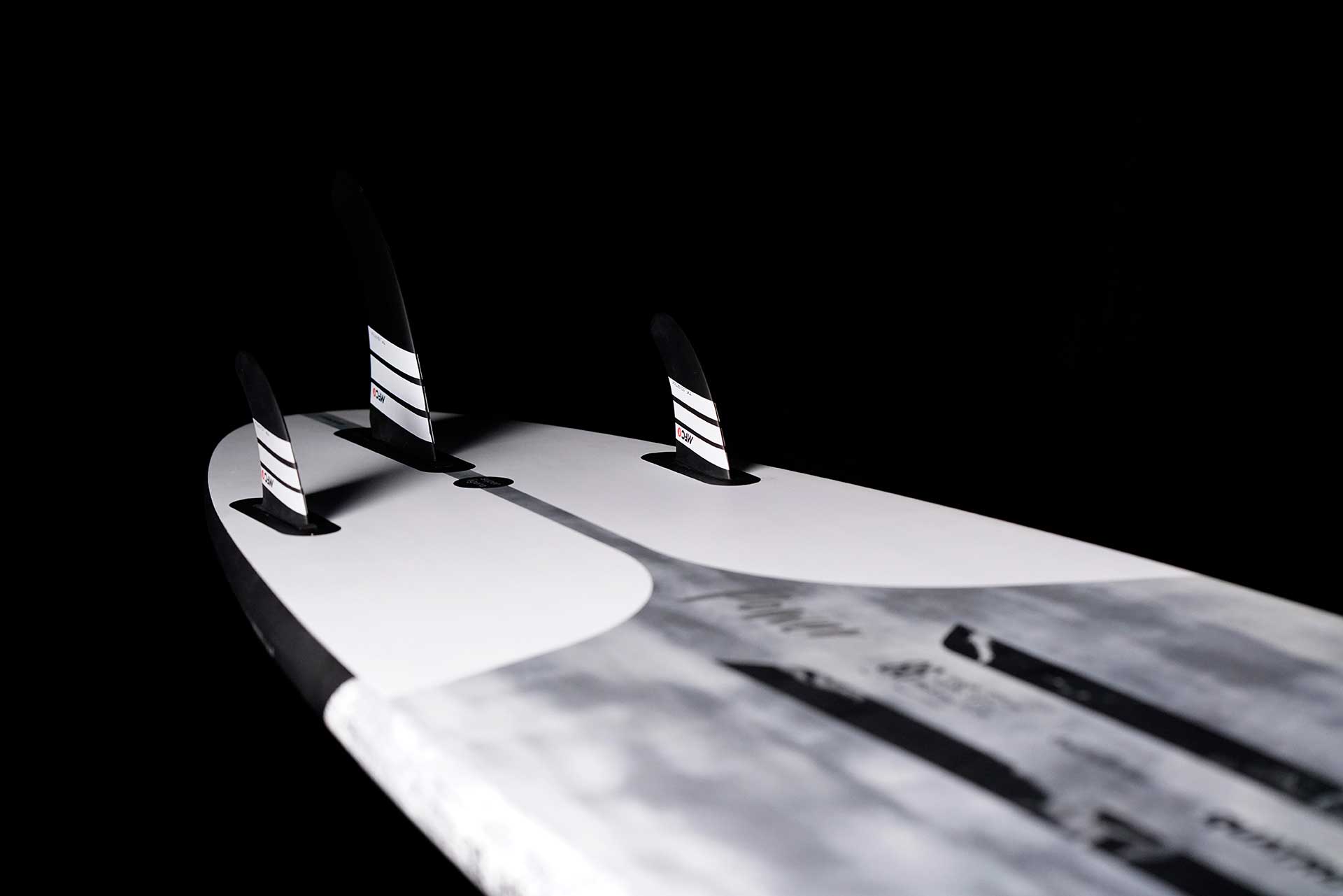 By far the most wave inclined board in the crossover test, the Power is Quatro’s “Free Thruster”. As with all of Quatro’s boards, the Power is finished in a clean black and white carbon finish and is produced in their established Pro Carbon Monocoque construction. Available in 4 sizes from 86 to 115, the Power is supplied with MFC’s thruster set-up but can be sailed as a single fin. The board also comes with four easily adjustable MFC footstraps, which can be set in an inboard or outboard setting. The Power flaunts a very fast rocker allowing the design to produce a reasonably flat section whilst also maintaining some scoop at the nose.