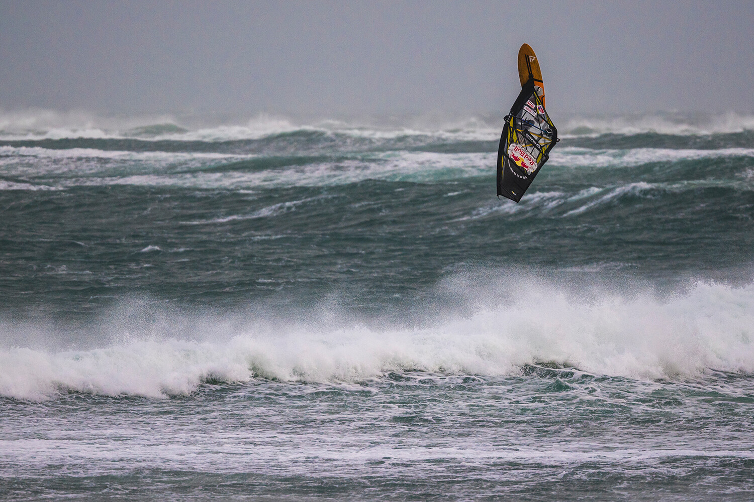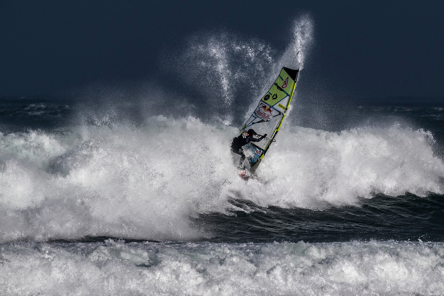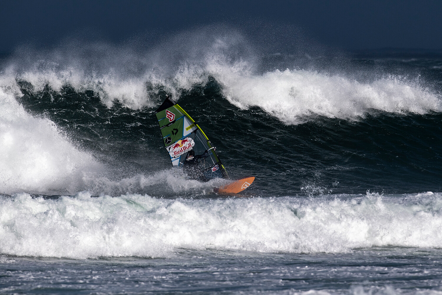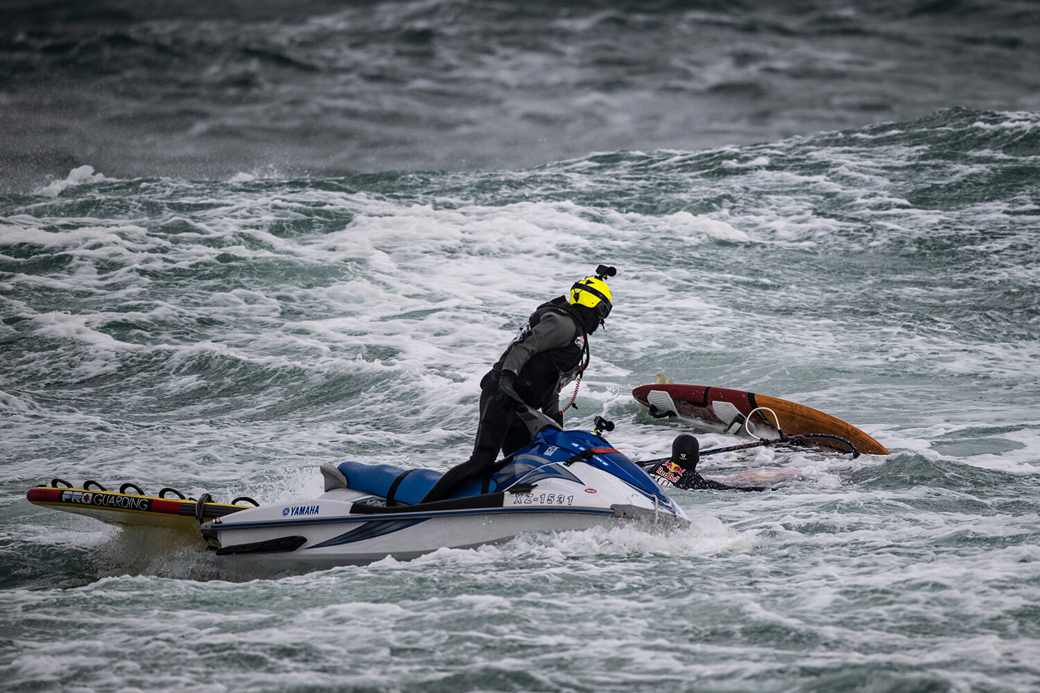 Competition during the first two rounds took place on the reef upwind, focusing on wave rides, but as the wave size increased and wind direction changed, competitors moved to the beach break for one final round of short heats – with winds gusting to 131kph.