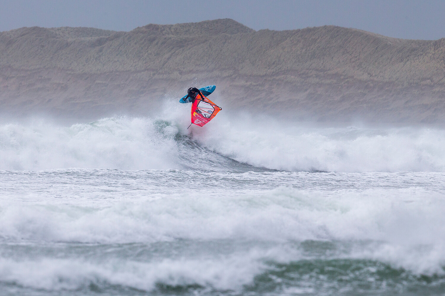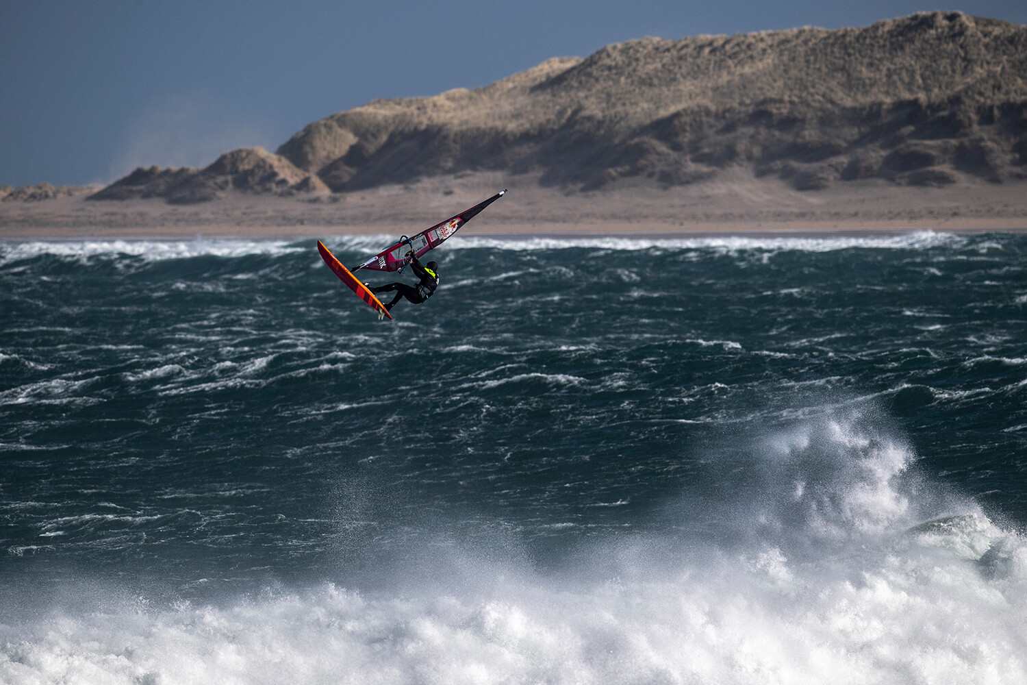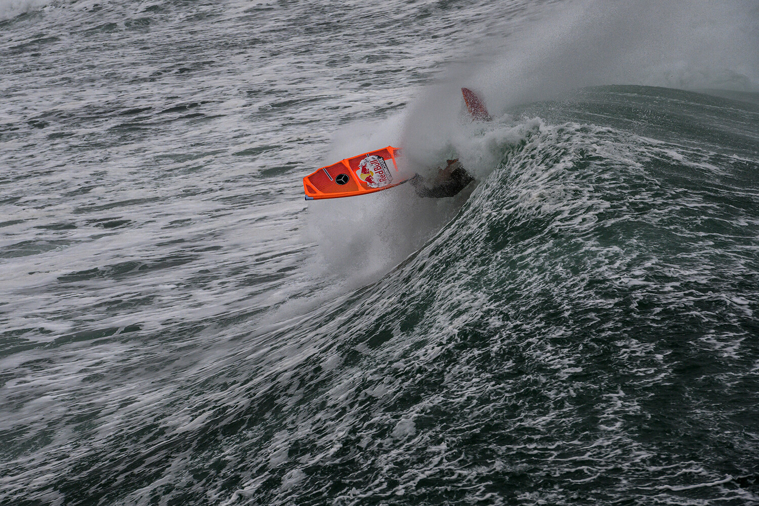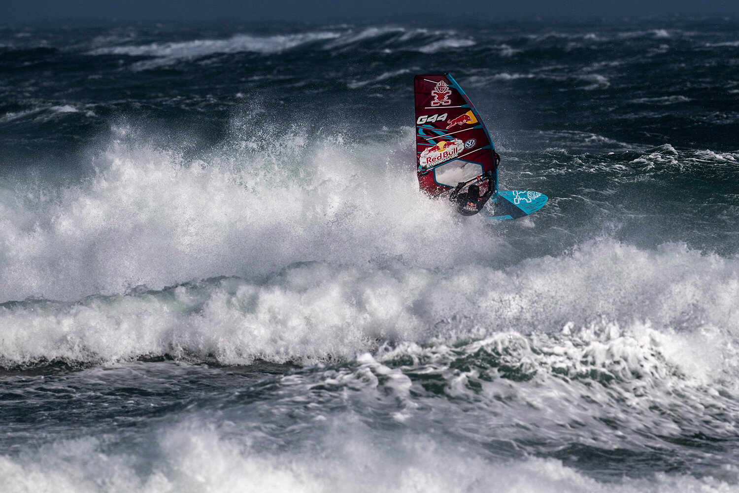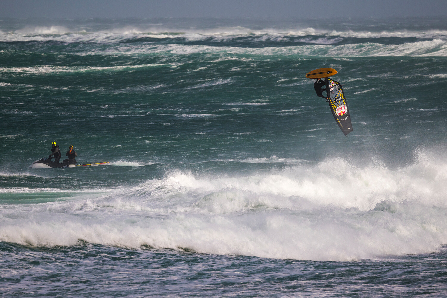 Competition during the first two rounds took place on the reef upwind, focusing on wave rides, but as the wave size increased and wind direction changed, competitors moved to the beach break for one final round of short heats – with winds gusting to 131kph.