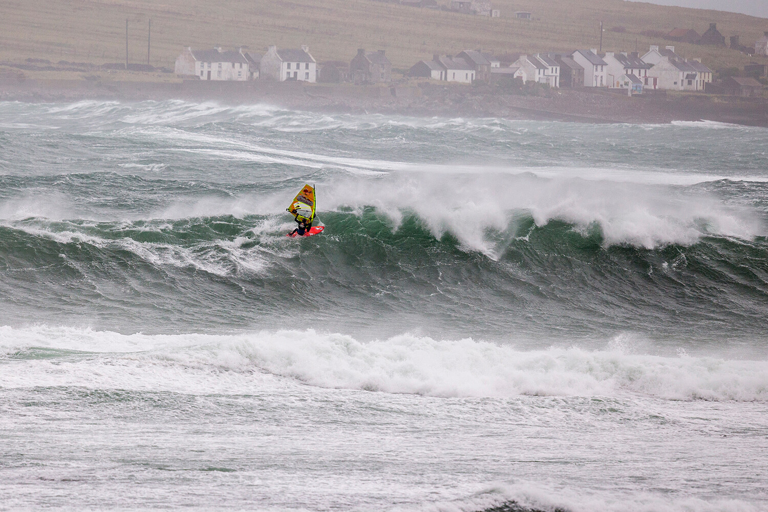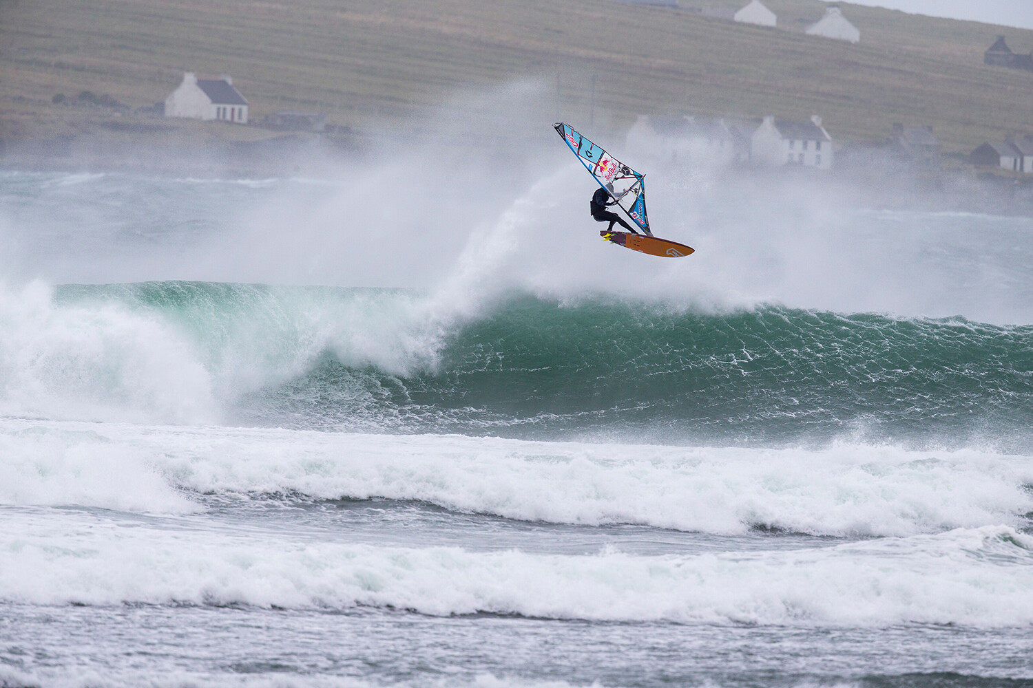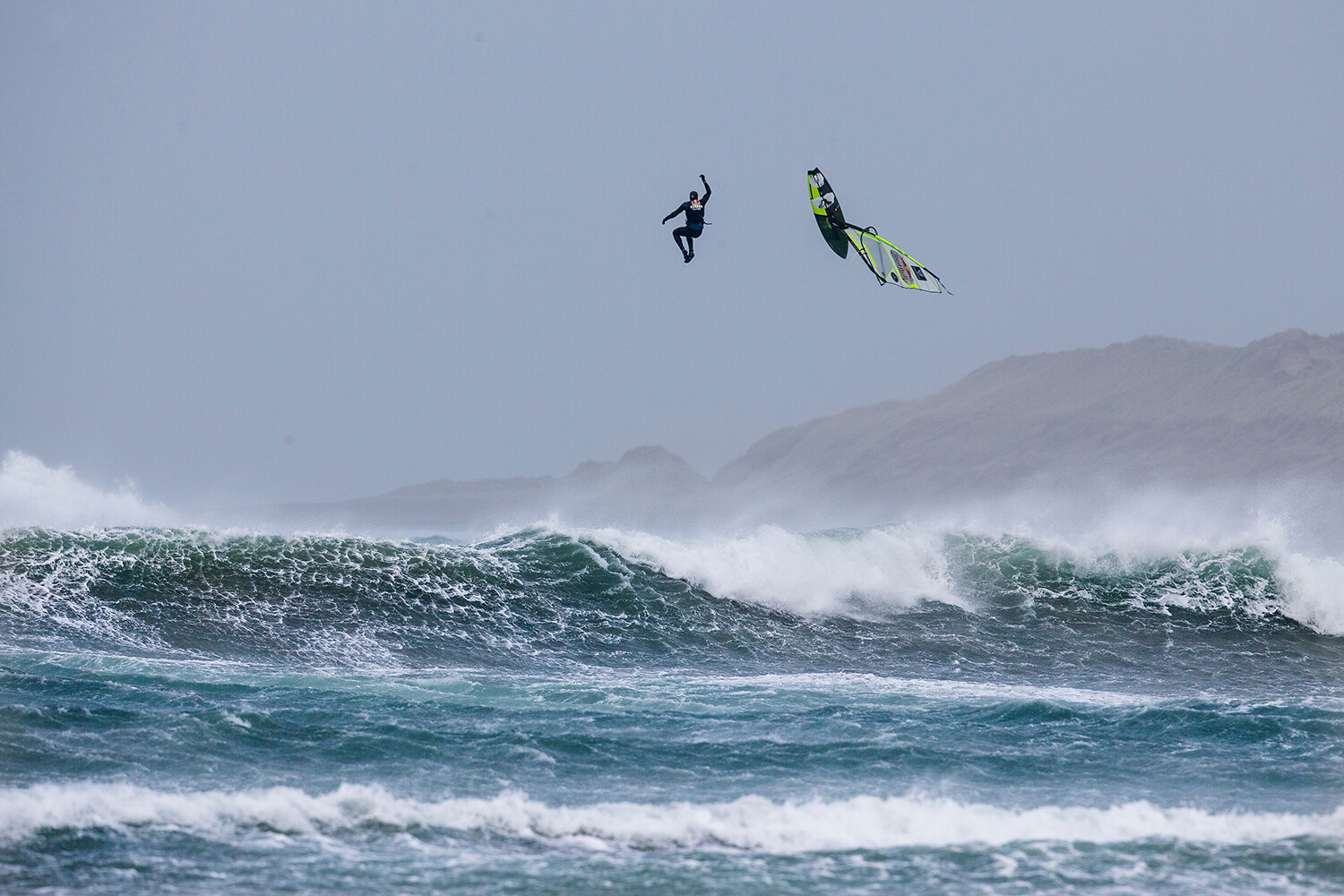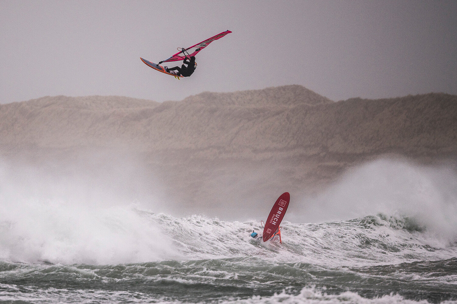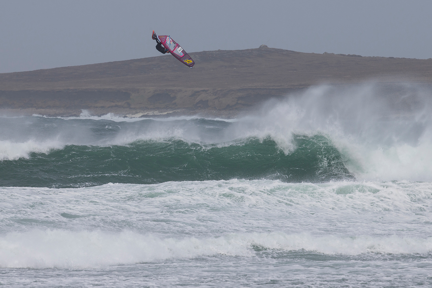 Although there was a warm-up day on Saturday, and a first day of competition on Sunday, alleyes were on ‘Big Tuesday’ when wind and waves were expected to peak. Driving over the hill in front of Magheroarty Beach, conditions initially looked calm – but quickly ramped up to the real deal as the tide dropped and the wind increased. As helicopter and jetski safety crews looked on, competition got underway.