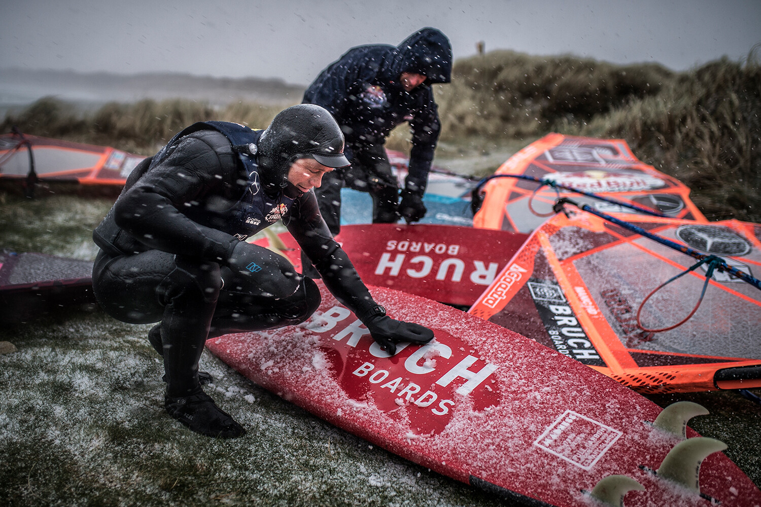 I suppose the best place to start is to say simply what a honour it is to be selected among the eight riders, sounds a bit cliché but it’s genuinely a dream come true! The other seven guys are sailors I look up to and just to be included with them is epic. Having found out you’re nominated and then it’s on, happens so fast it’s really a whirlwind after that. It’s really an event unlike anything I’ve ever been involved in and the RBSC team are incredible, definitely felt like a rock star for those 4 days… we even had guys to de-rig our gear which was quite a weird experience! Getting caught up in it all perhaps made the conditions more of a shock than I’d expected, coming from the UK. Sailing in the winter most years I thought I’d be used to the cold, but it was just so much colder than I’d expected, turns out Cornwall really is tropical! Part of me really loves just being out in those conditions, freezing cold and 60-70 knots. One squall came through in a heat I had with Leon and it was like being in a blizzard, full on snow and I could hardly waterstart it was so windy. The vision of snow with the big rolling swell and speed of the wind gusts on the water will stick with me forever, such an epic sight. The hood and crash jacket didn’t affect my sailing too much. I really struggled with the gloves though, I just couldn’t get used to even the palm-less mittens, the boom kept just slipping out of my hands at really key moments. Just how cold my hands were is something I really hadn’t expected, even with all the adrenaline it didn’t hurt any less! If the first day was the coldest, the second day was definitely the windiest, I would say the windiest I’ve ever sailed in, they were getting 70 knot gusts on the beach, I mean people were getting blown over just stood on the beach! I had an 80 litre Fanatic Grip and a 3.4 which normally feels pretty small and it felt huge in those conditions! Probably going for a stalled forward that afternoon was the scariest point of the event, going up in the air was like the worst turbulence on a flight you’ve ever had, you were just moving up and down in the air, just trying to hold on for dear life. Personally one of the things I really loved from the event and something that really made the event something special was hanging out with the other seven riders in Ireland for a few days, that was just awesome. We had a lot of laughs and I think because we’re not really sailing against each other in those heats it means we all kind of relaxed a bit more with each other. I think Robby mentioned it’s the people that make being a competitive windsurfer the pleasure that it is and I couldn’t agree more!