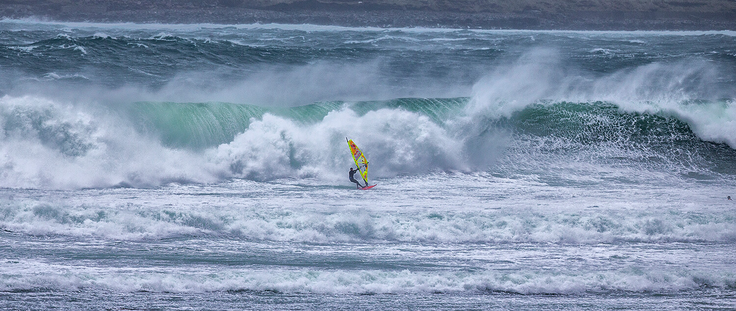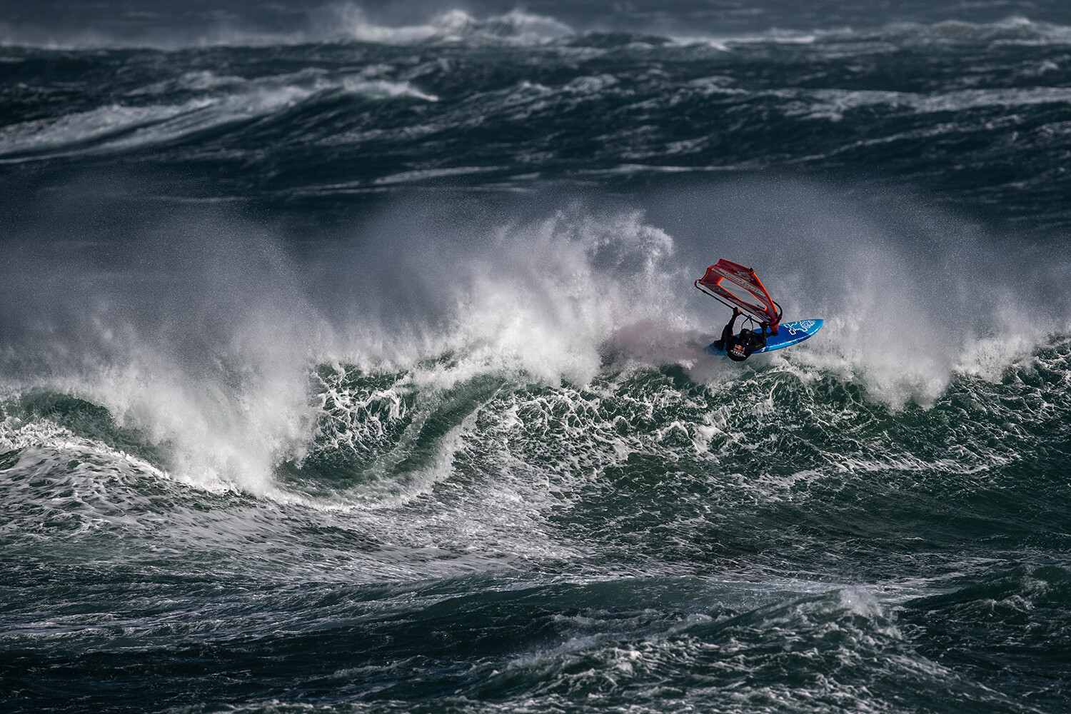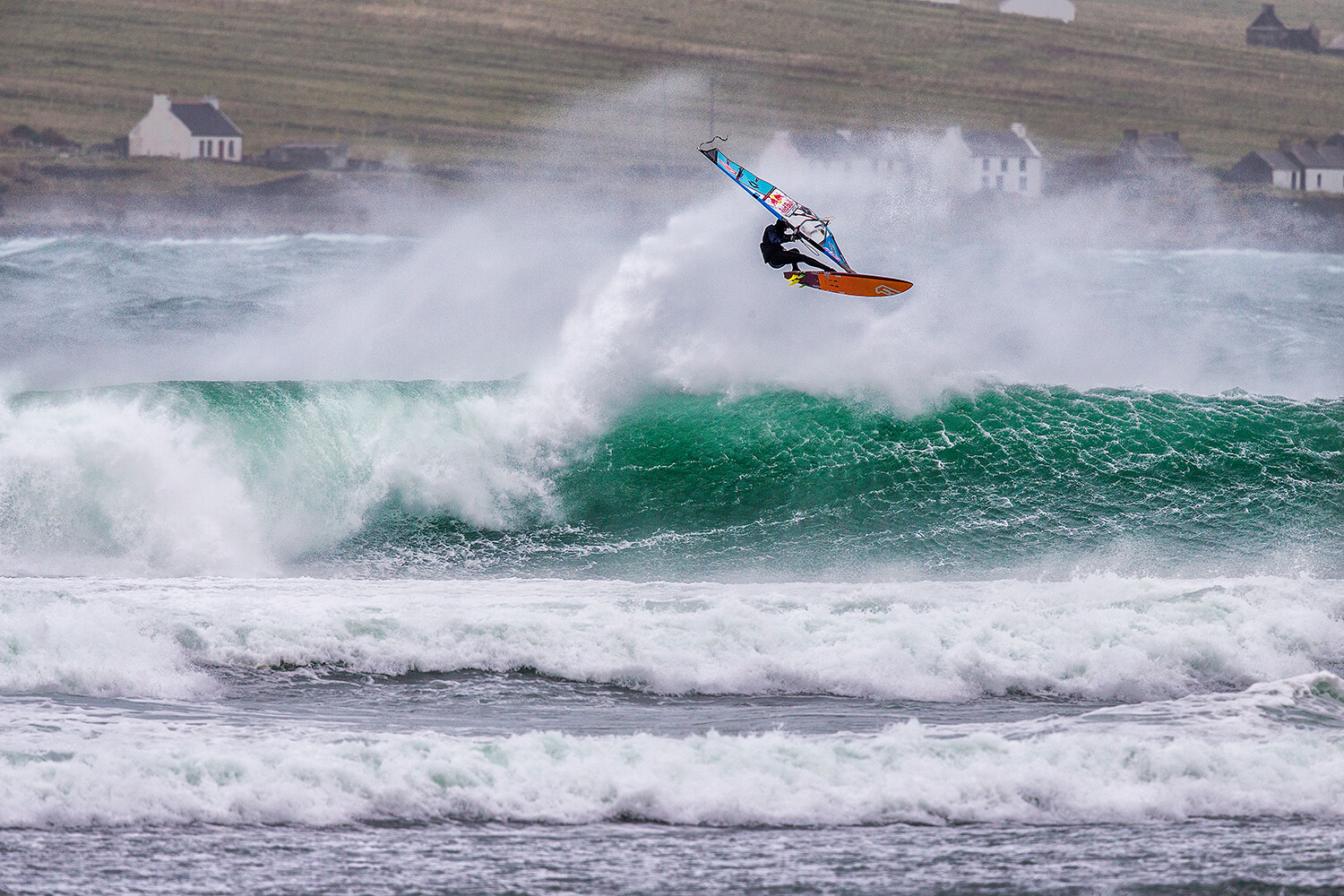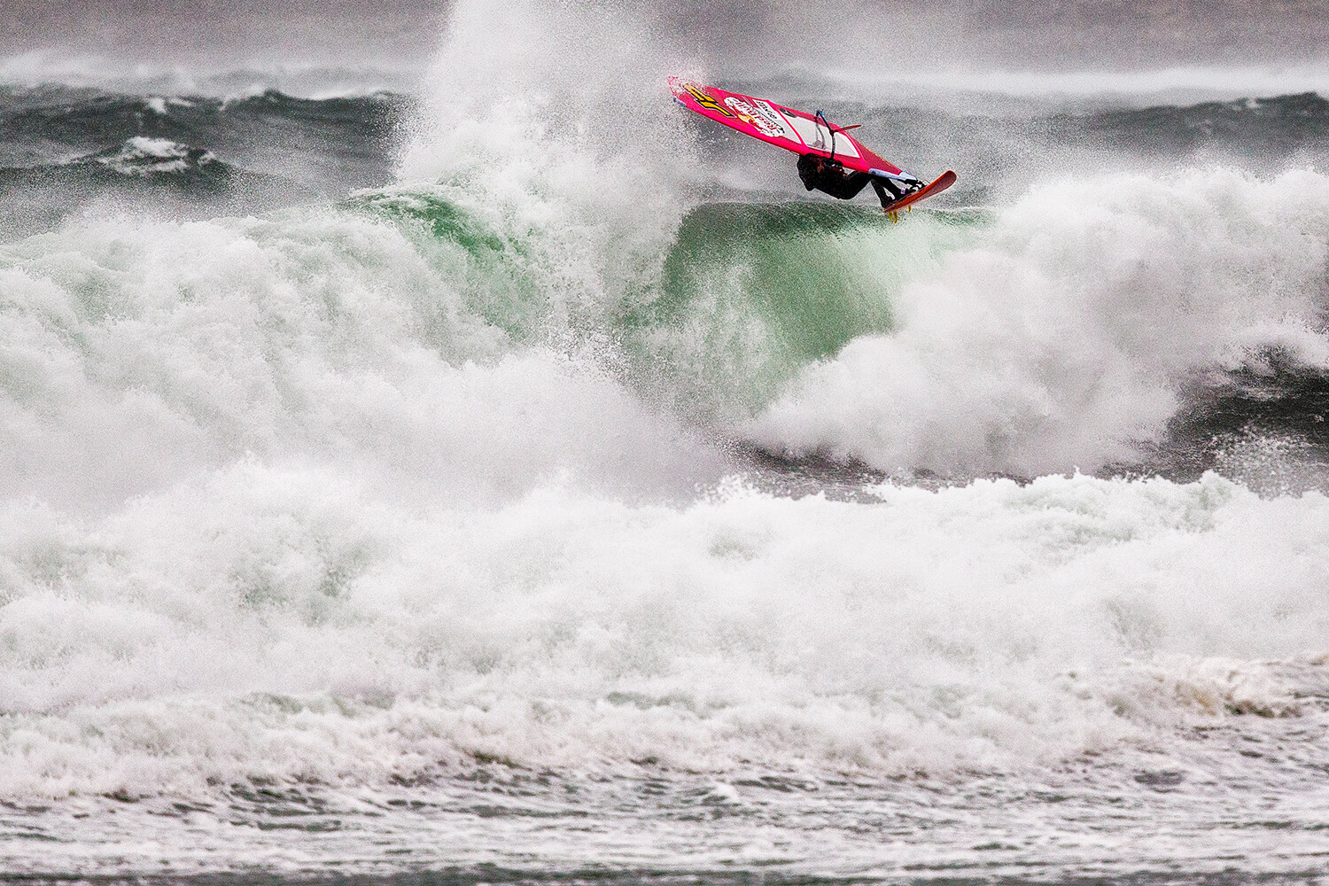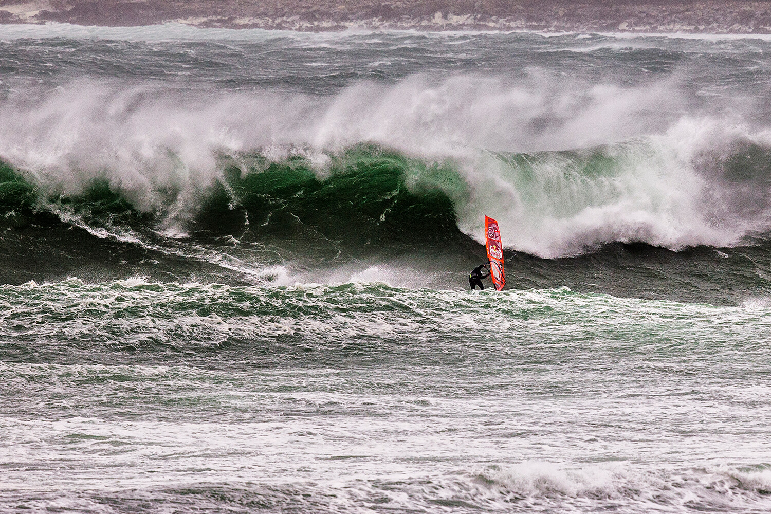 All the Storm Chase missions were completely different and I will remember them all for the rest of my life, that is for sure. They had a big impact on my career as a professional windsurfer and I experienced incredible moments along those journeys! Every time I come to Ireland the Irish hospitality surprises me, again and again. When the border control just smiled at me and let me pass after I presented my expired ID, I knew I would have a great time in this country! Staying for almost a week in Magheroarty was great too. Everyone was happy and stoked to see the Storm Chasers come to this remote place and play in the ocean. My windiest heat was the very last one when they measured 131 km/h wind speed at the beach. I was on a flat trimmed 3.0m and really, really powered up! Coming back to the beach it was too windy to walk up and I had to sit and wait for the strongest part of the gust to pass by before I was able to go up the beach.