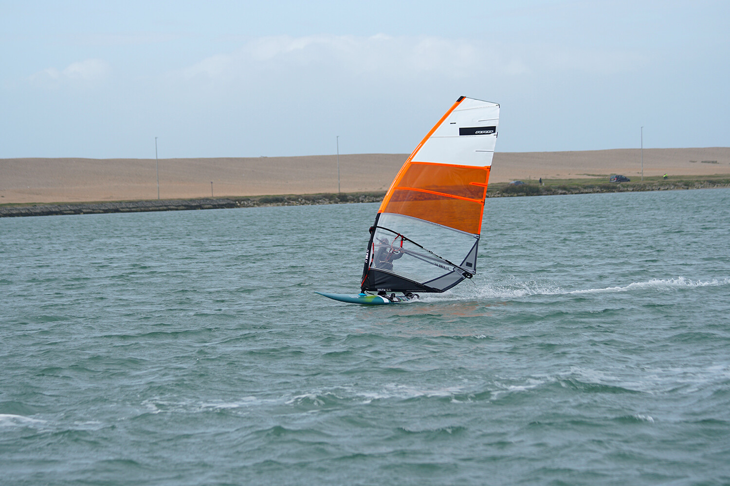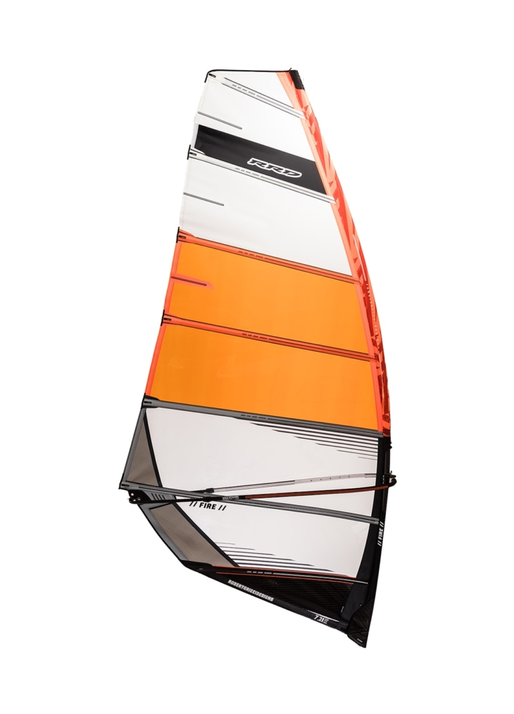 The Fire is in RRD’s Y25 range as their ‘Performance Freeride’ model, offering a wide base of nine sizes from 5.0m to 9.0m. The brief and focus of each size evolves though the series, from bump and jump in the smaller sizes right through to a twin-cam in the three largest sizes. This 7.6m is the largest no-cam option, fashioned with seven battens (many of which are tubed), a negative leech outline, double clew eyelets and reduced head size – all measures to improve handling and top end control. Rigged here on a Dynamic Pro Comp SDM (whilst still compatible with an RDM), it is easy to tune thanks to the marker in the top panel, (dubbed their “integrated trim system”) which helps to achieve the right amount of tension prescribed by RRD’s sail designer John Skye. And with a luff of 482 cm, it is certainly a tall sail, its size accentuated by the long boom length and concave leech outline. Displaying a moderate amount of luff curve amongst its peers, the Fire possesses a good amount of depth to its profile at rest, with all four lower battens exhibiting rotation around the mast. Sporting x-ply in the luff and clew panels, the rest of the Fire’s body is fabricated in monofilm, with a clean set and visually striking in its 25-year anniversary colours. Alternatively you can opt for the more monochrome orange livery.