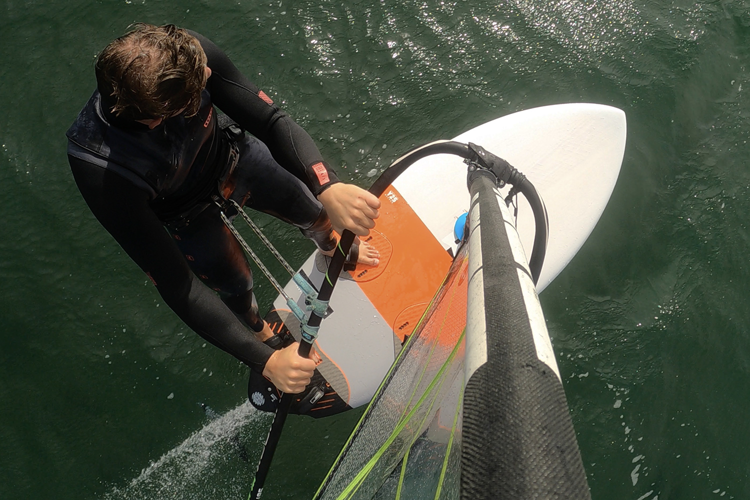 The Freemove Flight is RRD’s windsurfing / wind-foiling crossover machine, of which they claim to it being “the shortest freeride board on the market”. Its short length isn’t the primary observation you make when you first lay eyes on it, however, but its dramatic egg-shaped outline! Its 85cm wide-point is forward of the board’s mid-point, yet quickly rounds to a pin-nose, giving the 135 such a distinct appearance. The idea behind the design is to provide the board with extra control and comfort, with either a fin or a foil in place. In the rear there’s a pronounced wingered tail, to assist in manoeuvrability and around the corners. It is also extremely thin in profile, with a long rocker flat and even volume distribution throughout. Tested here in LTE construction that uses a ‘single shot’ process, it features a wood laminate on deck and hull, which is actually visible through the white deck graphic. And whilst there’s a dearer LTD version, or a price-pointed E-Tech option, this LTE version tipped the scales at 8.19 kg. It comes supplied with four of RRD’s firm Velcro footstraps, which take time and patience to adjust, but set well, and a 44 cm G10 Liquid Pro fin from MFC. There are dual density diamond grooved pads seating inboard and outboard strap positions in the domed rear and a long mast track for cater for the mammoth quoted sail range of 4.0-8.0m.