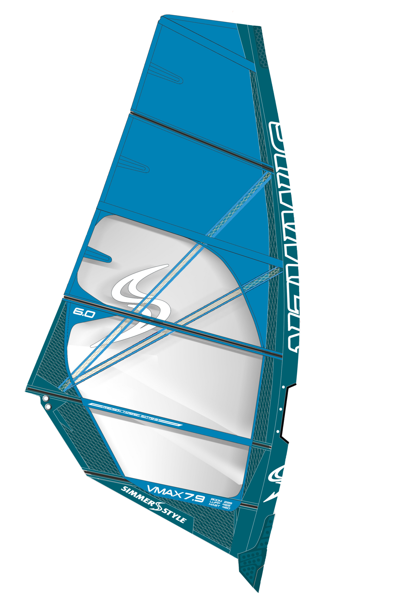 The cutaway clew of the V Max allows the rider to set up with a more rigid boom, which is simple to set in the rig’s singular clew eyelet. The V Max also features 5 mil X-Ply in high-stress areas of the sail, the most durable laminate scrim on the market, Simmer say. The 100% polyester film, 150 microns thick, with high stretch resilience thread reinforcement in an X-pattern, is bonded together with a UV resistant glue. X-Ply is also used on the batten pockets to ensure shape is maintained over time by minimising the potential for stretch. Overall the V Max is a classy-looking sail that is simple and easy to rig.
