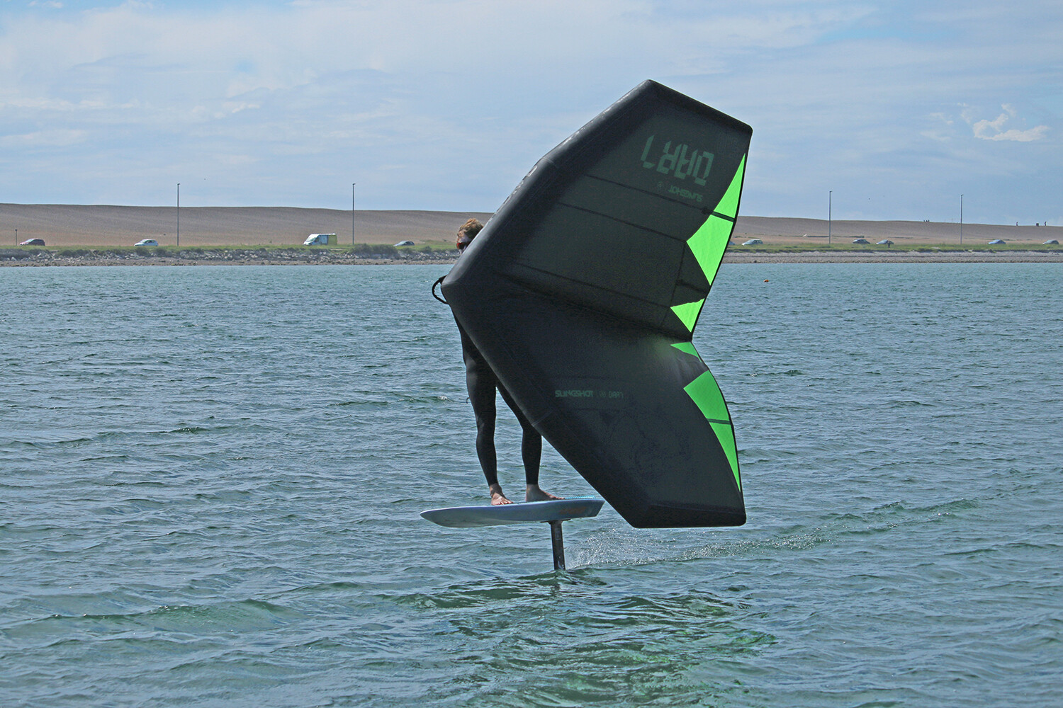 Slingshot’s third generation wing – the Slingwing V3 – was just a little late to the party for this test, so we found ourselves lucky enough to try this unique alternative option from this American juggernaut of a brand. The Dart is summed up with the adjectives of ‘speed’, ‘power’ and ‘boost’ and is aimed squarely at the more experienced pilot – those that are wanting to push the limits of their own performance … and the boundaries of the sport itself! It is quick and easy to inflate, the centre strut self-inflating as you achieve the prescribed 6 PSI. And whilst this certainly isn’t the highest pressure recommended in the test group, the broad diameter of the Dart’s leading strut and its extreme vee geometry means it certainly exhibits a stiff and rigid structure. Its low-aspect planform, swept back ‘Delta wing’ outline, and even its highly purposed and intended colour-scheme, provide the Dart with a somewhat ‘stealth fighter’ mystique. Well-engineered and detailed, it has Kevlar patches on the raised wingtips and neat details such as a neoprene patch behind the neutral handle. The canopy itself is extremely loose, reinforced with mini-battens along the trailing edge to mitigate flutter, whilst the handles are carefully engineered with soft seams to improve ride comfort. There are six handles along the centre strut (the power handles sited a long way to the rear, giving an idea of intent), complimented with Y handles that are said to serve the additional purpose of keeping the wingtips under tension. There are also a couple of harness line attachment points, sited between the handles, so that you can, as Slingshot say, “hook in to bring that heart rate down”!