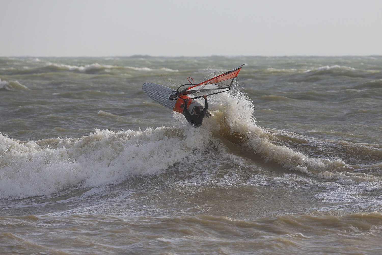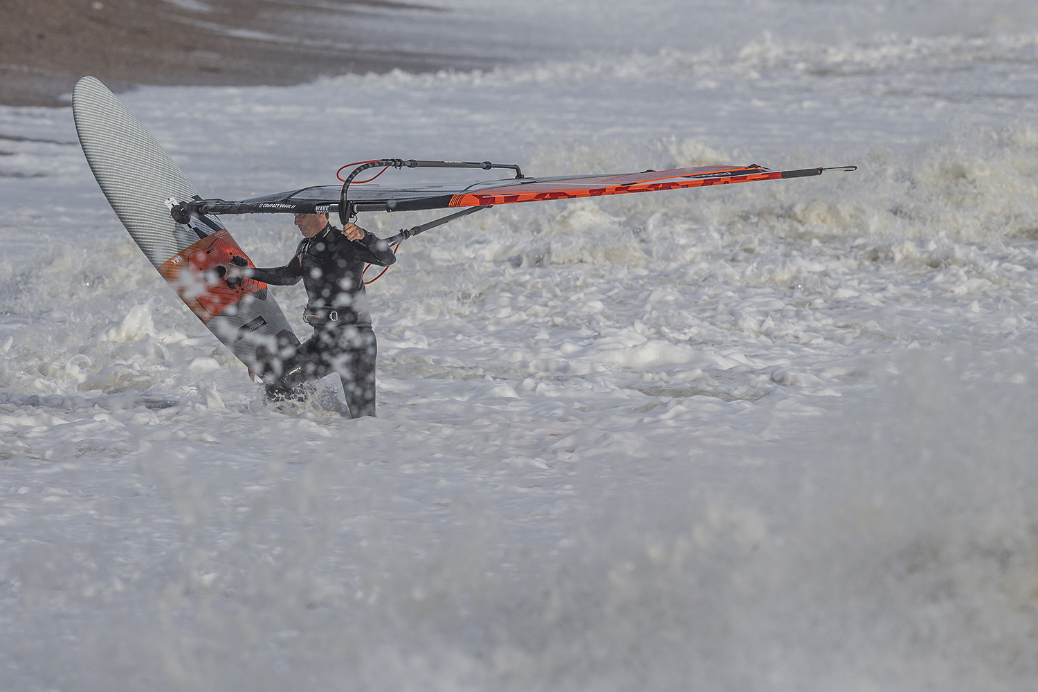 Borrowing my parent’s car I didn’t think they would be too happy if I drove in a wet wetsuit, so after a quick de-rig and change we were off down the coast. Arriving at Worthing it was looking really solid and we were rigged again in minutes. Then came the next miss. I am never one to hang out my suits to dry in Gran Canaria and regularly put on, not only wet, but also slightly mouldy suits. However, no matter how wet they are, they are never as cold as a UK wet wetsuit. Again the smile beamed across my face as I pulled on the wet and very cold suit.