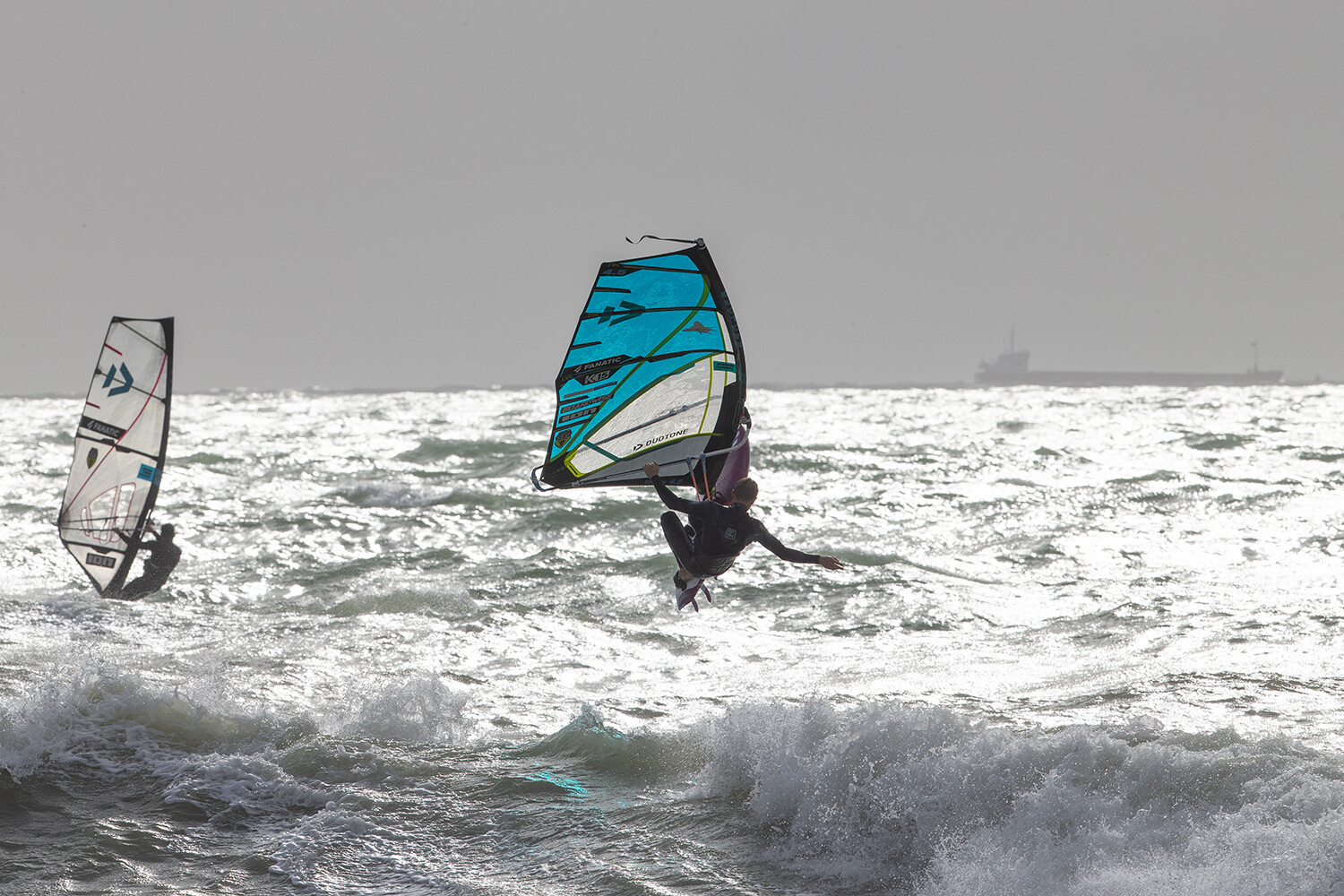 When I heard John Skye was coming along, if I am really honest, I suddenly felt nervous. It took me back to being a pro windsurfer when everybody was still scrutinizing me performing whenever I sailed. I always felt I had expectations every time I came home of what I was doing on the water. I never wanted to fall off learning moves or make myself look silly and I think I put too much pressure on myself. Even after quitting competing I did that for a long time. It has taken many years to let go of that pressure and realize I am not a pro sailor anymore and I have not been for ten years. I am just out sailing the same as everyone else. I actually sail a lot less than most guys because I am busy with work. So now I feel I don’t have to prove myself anymore, I am not paid to go windsurfing. I am going out because I love it. As long as I walk up the beach with a smile, I don’t care what anybody thinks. When JC said Skye was coming along, I suddenly thought, ‘I am going to look daft!’ as I know he sails a lot. Then I thought, who cares, it will be nice to see him, he is a lovely guy and I have always liked him on and off the water. We are both still in the industry from slightly different angles and we are both retired from competition, so I guess we have a lot in common. He has a family as I have, so it was lovely just to sit and chat and catch up. Because he was on the water, it actually pushed me. Rather than sitting on the beach chatting with the boys every half an hour, I stayed out on the water and kept going. My forearms at the end of the day were in agony from hanging on in the wild gusts! I absolutely loved it. Skyeboy is such a good sailor and made it more of an exciting session. After the day I sat and had a chat with Sam Latham and we were just recalling what a great day it was. I did not expect to be sailing with John Skye and we had some great conditions. I was well stoked.