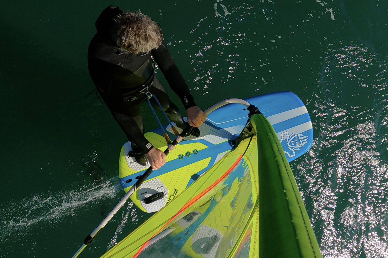 Wide and voluminous, the 150 is super stable and easy off the plane, capable of carrying large rigs and riders. Having taught wind foiling at the OTC centre for a number of years, we’ve come to understand that, unlike conventional ‘fin’ windsurfing, the greater the volume in a foil-specific board doesn’t necessarily equate to a more user-friendly or practical capacity for the progressing rider. Quite the opposite in fact. Wide bodied foil-specific platforms, with their straps placed far away from the board’s centre line are unquestionably harder to foil well than their narrower siblings, 25-30 litres their junior. They are harder to trim and more awkward through transitions. So it comes as no surprise that Starboard recommend this 150 for use with their new Freeride+, GT or GTR(+), or even their Race foils – more directional and efficient engines than the Super Cruiser for example. As such, the 150 thrives on being loaded with a larger rig and a higher aspect, more performance focussed foil. The straps are found with a good step out, securing feet in both straps to really connect with (and pump) the foil to maximise marginal wind release. There are inset plug options for both the front and back straps, which can serve as training options, or to help temper the ride … but it’s like buying a supercar and driving it around town to do the food shopping; there is so much more to give! Once flying the Foil Freeride feels large and purposeful, covering distances with ease, the straps and deckpads offering assured and reliable contact with the foil through the board. There’s plenty of width in the tail to drive the foil and explore its performance. It’s not going to be a match for the 91 cm+ wide race-specific foil boards out there, yet as a recreational freerace-esque board blending accessible performance with comfort and enjoyment, it fits the bill well. In the gybe the 150 does feel its size, encouraging the rider to nurture good technique such as the double step-over with the back foot to settle the board initially, before moving the back foot to the rail and applying pressure through the turn.