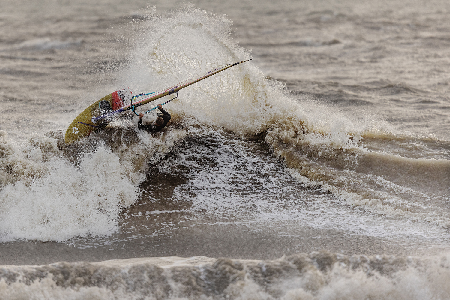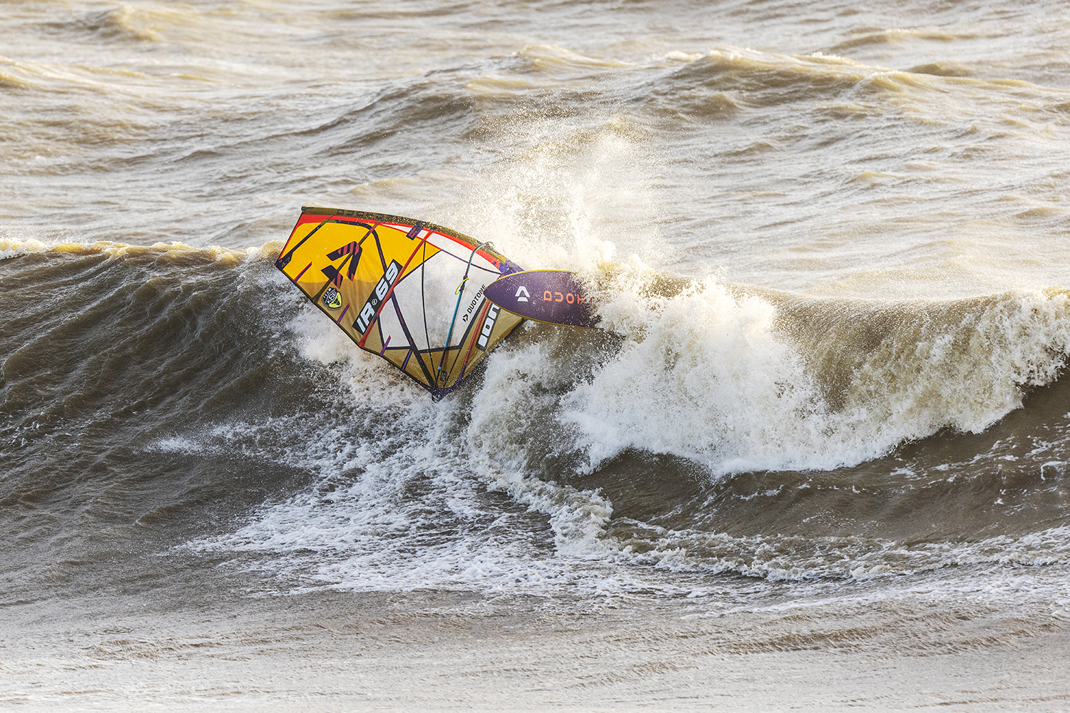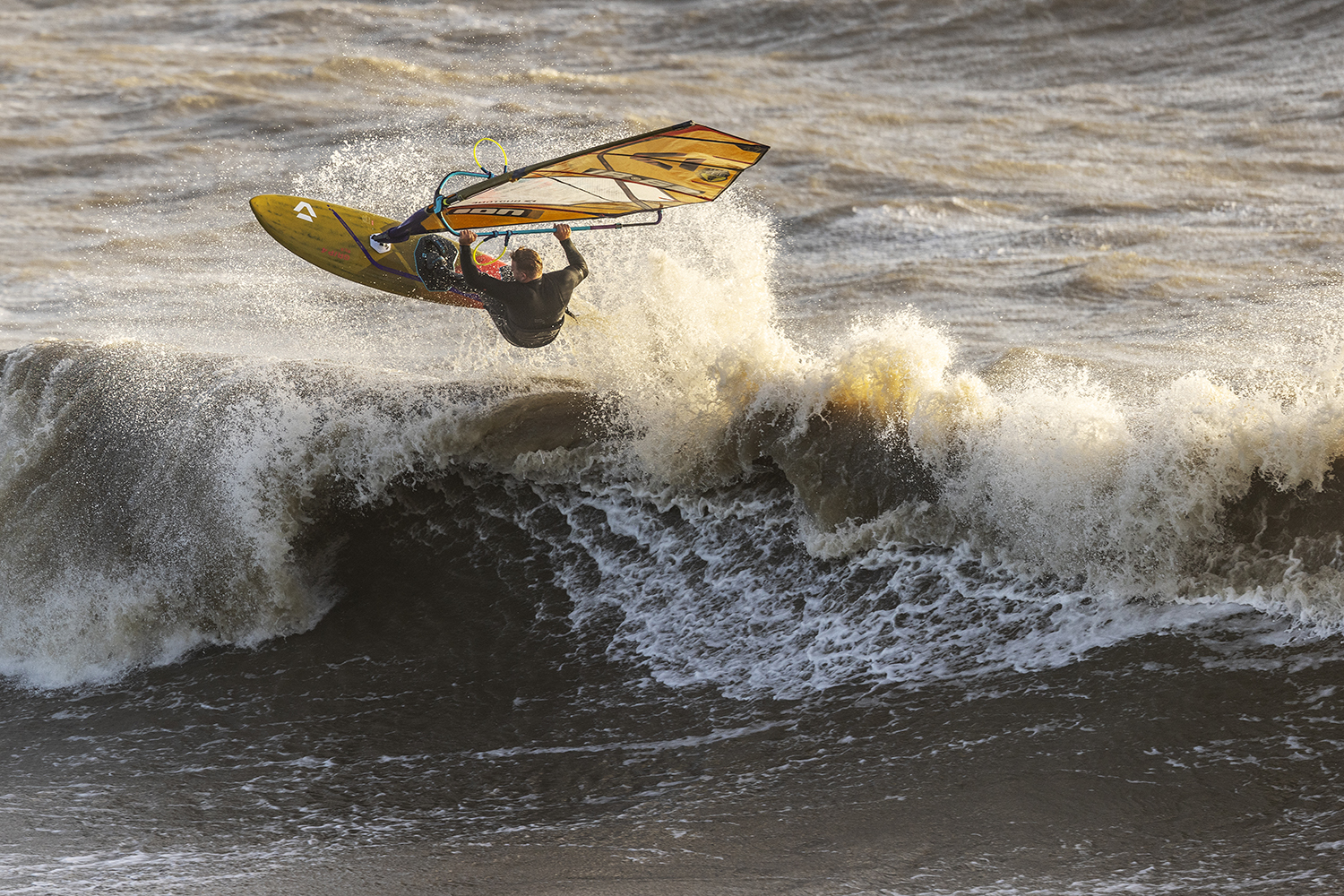 Ten minutes after the boys hit the water, I could see blue sky slowly edging its way from the west. It looked like Santa was late with his delivery, but we were not complaining. The conditions looked epic, but sailing was actually trickier than it looked. The wind was side offshore, but at the same time most of the sets were coming in at an angle where they were bending away – making it tough to smack the lip. It was taking the boys a while to dial in and there were plenty of big swims going down as both Timo and Ross tried to nail some big 360’s and airs. As the tide pushed in during the afternoon, the stars started to align and there were plenty of golden moments as Timo and Ross traded waves in the crisp winter sunshine. Timo was riding his Duotone Super_Hero 4.7 and Grip 4 87-litre both all in gold and as the session progressed, he was dialling in some big vertical hits, 360’s and aerials. Ross was on fire and finding all the best sets, driving into his bottom turns and smacking the lip with his aggressive surf style riding.