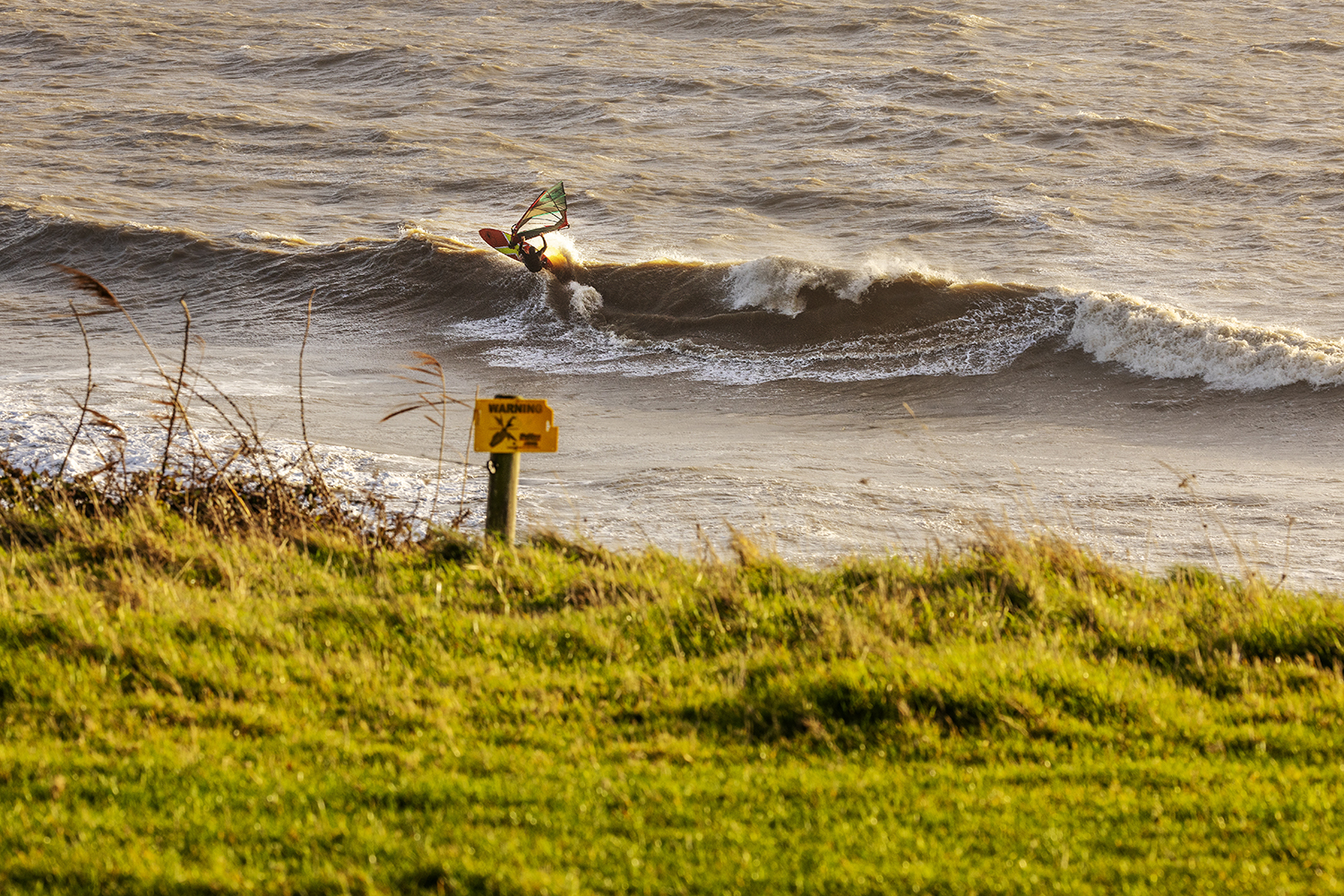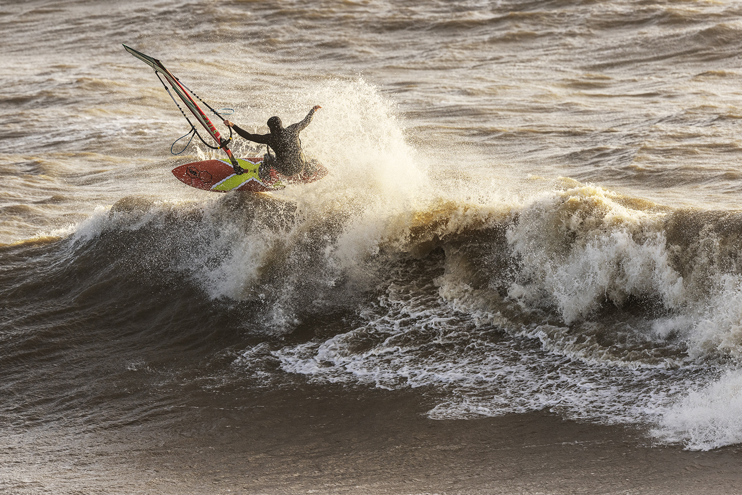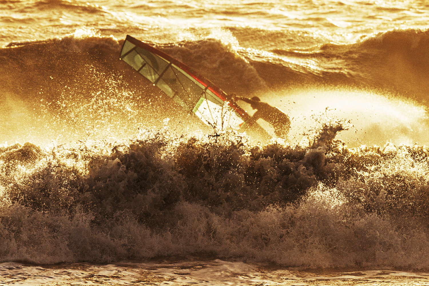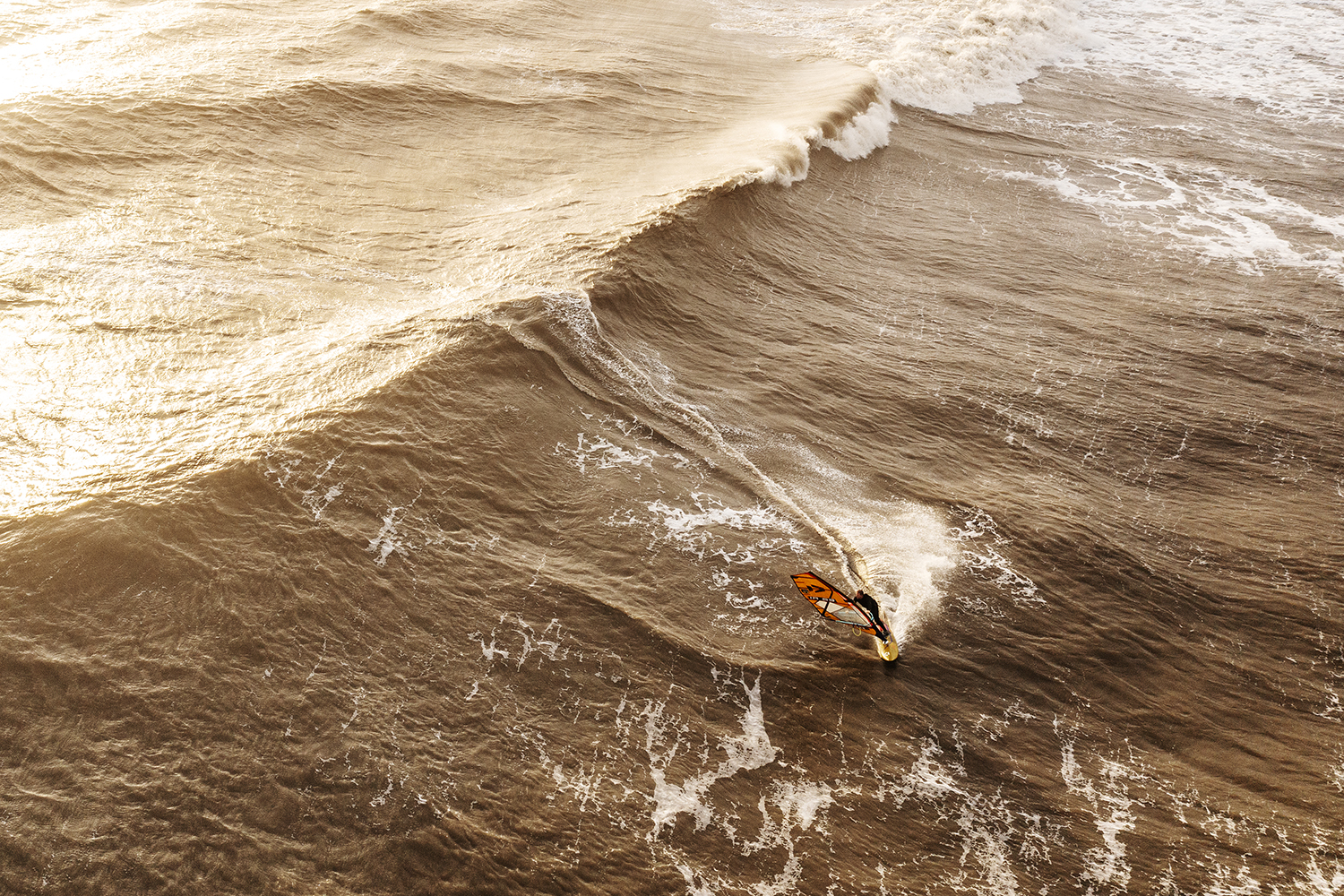 Ten minutes after the boys hit the water, I could see blue sky slowly edging its way from the west. It looked like Santa was late with his delivery, but we were not complaining. The conditions looked epic, but sailing was actually trickier than it looked. The wind was side offshore, but at the same time most of the sets were coming in at an angle where they were bending away – making it tough to smack the lip. It was taking the boys a while to dial in and there were plenty of big swims going down as both Timo and Ross tried to nail some big 360’s and airs. As the tide pushed in during the afternoon, the stars started to align and there were plenty of golden moments as Timo and Ross traded waves in the crisp winter sunshine. Timo was riding his Duotone Super_Hero 4.7 and Grip 4 87-litre both all in gold and as the session progressed, he was dialling in some big vertical hits, 360’s and aerials. Ross was on fire and finding all the best sets, driving into his bottom turns and smacking the lip with his aggressive surf style riding.
