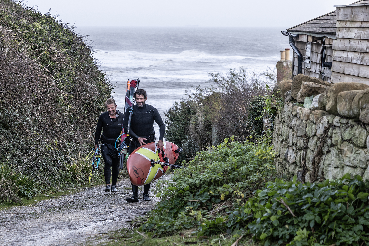 Ross smashed out a quick session at Bonchurch in the drizzle. The wind had already swung west, but so far there was no sign of the promised clearing skies and nuclear winds. The weather may have been dreary, but Ross nailed some pretty sick turns on his new Tabou Da Curve, Thomas Traversa’s new Pro model. By midday Ross had called it a day and we all convoyed over to Niton for the main session of our Christmas celebrations. Weirdly there were no surfers around, and we were the only three in the car park, although that might have had something to do with flooded roads and an almost impenetrable track down to the beach. We made it down OK, but getting back up, especially with Timo’s rattling exhaust could be an issue. Would we have to call on Santa to borrow his reindeers to tow us out? We would find that out later. Meanwhile, down at the bottom of the track, the conditions looked pretty epic and we were greeted with logo high waves and ideal side-off winds, so the boys wasted no time rigging up.