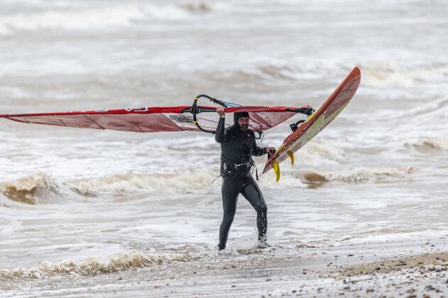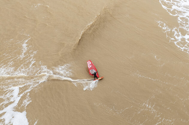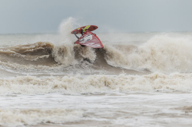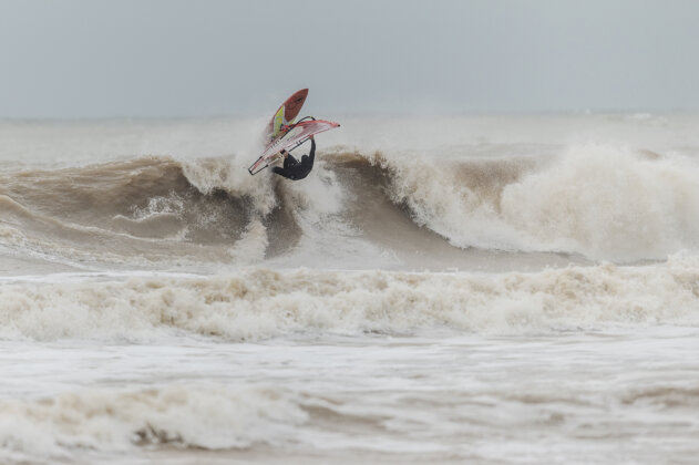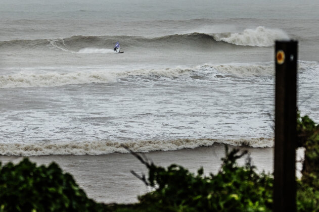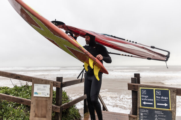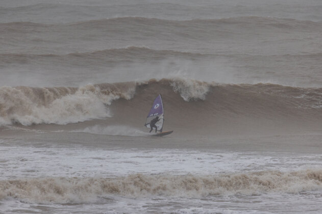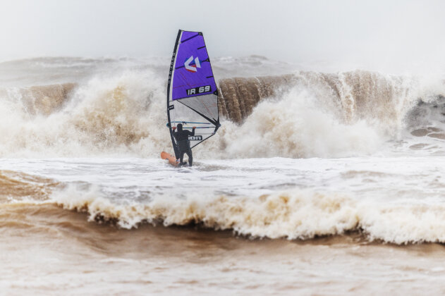 As soon as I arrived, the weather flipped from beautiful to torrential rain and the swell jumped fast…from head high to solid mast high with some bigger sets. I sailed the first hour alone in some seriously heavy waves, thick, unpredictable and exploding on the sandbars at low tide. In hindsight, a three metre swell at 17 seconds really needs a reef, not a beach break, but even if it was too big to do anything truly rad, it was still 100% worth it because nowhere else was happening. It was solid mast high but the lip of the wave was incredibly thick. Low tide made it even more heavy and it was exploding on the sandbar. It was just too big to do anything rad! It was great to visit JC’s home spot for a change and catch up with Ross.