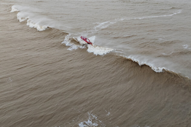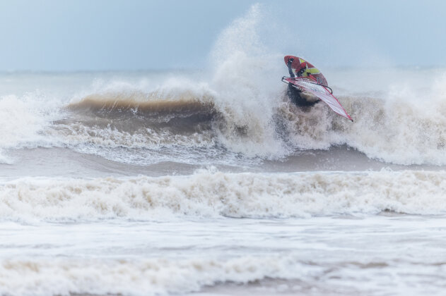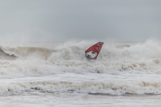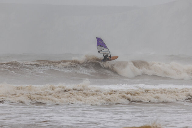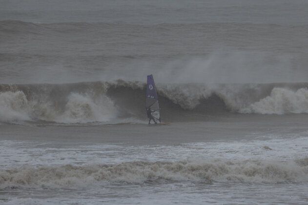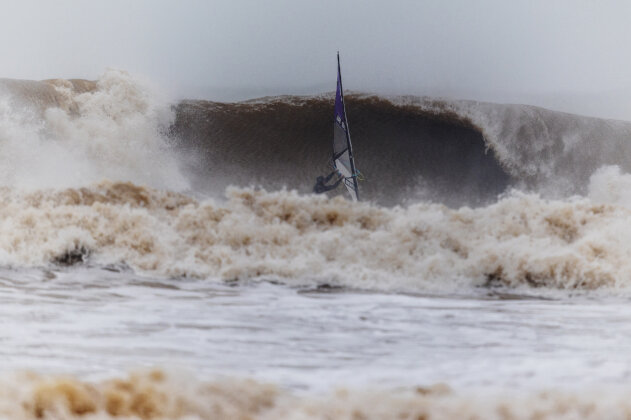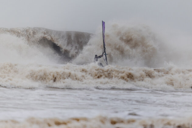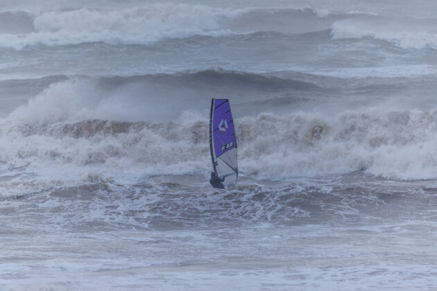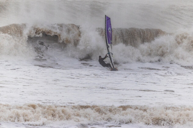 Ross arrived around 3:15pm, wasted no time rigging, and charged straight into the chaos. By now the waves were even bigger and heavier…but just to keep things interesting, the wind had started to back off. Ross fought his way out, taking several full-force poundings along the way.