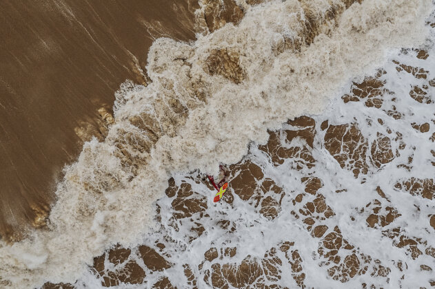 Choosing his moment carefully, Timo soon dropped into a set wave, screaming down the line on a chocolate-mast-high wall. Glory beckoned…briefly. The wave was hollow, ugly and in absolutely no mood to be messed with. Any attempt at an aerial would have ended in a swift, humiliating beat-down. Sensibly, Timo straightened up as the wave avalanched behind him in a brown, angry mess.