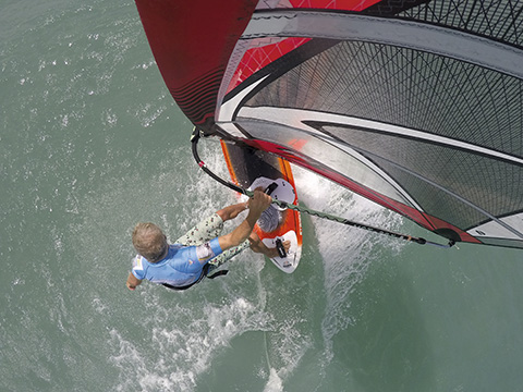 What article would be complete without a no hands mast mount GoPro shot – except it is a very good pose and angle from which to make some serious points about high wind trim and stance. Firstly you don’t need to grip – if in 25 knots you can’t sail with at least one hand off, then check line position and boom height and make sure the sail is releasing (downhaul) and has enough shape (outhaul).