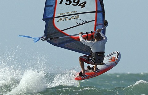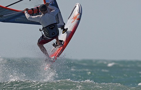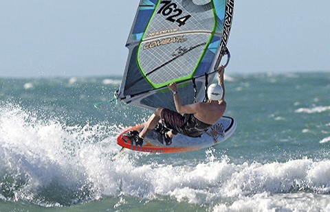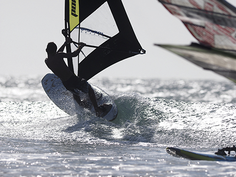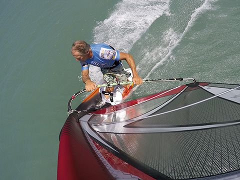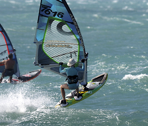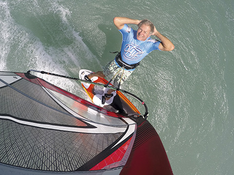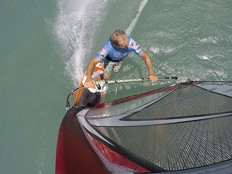 // But across the wind, your body is more inboard so you can take off on your toes, lift the windward edge and get air under the board. Lars is now in perfect shape to lift the tail upwind and soar.