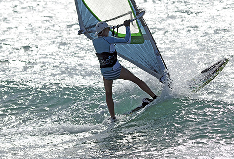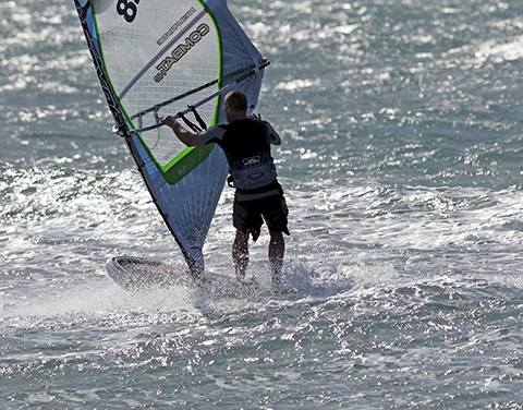 The nature of the strong wind is that it hits the stationary sail like a bullet. You feel a real jolt in the arms. “I’m over-powered,” you shriek. No you’re not – but instinctively to avoid a catapult you hunker down and bend the arms. But if you pull the rig back and power up the tail, you head up and with only a tiny fin to resist the force, you crab sideways and stop.