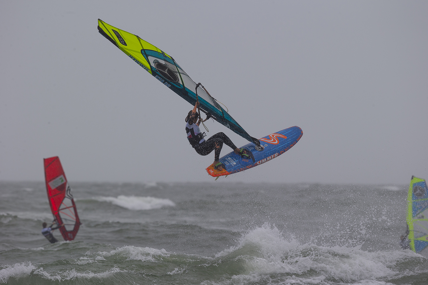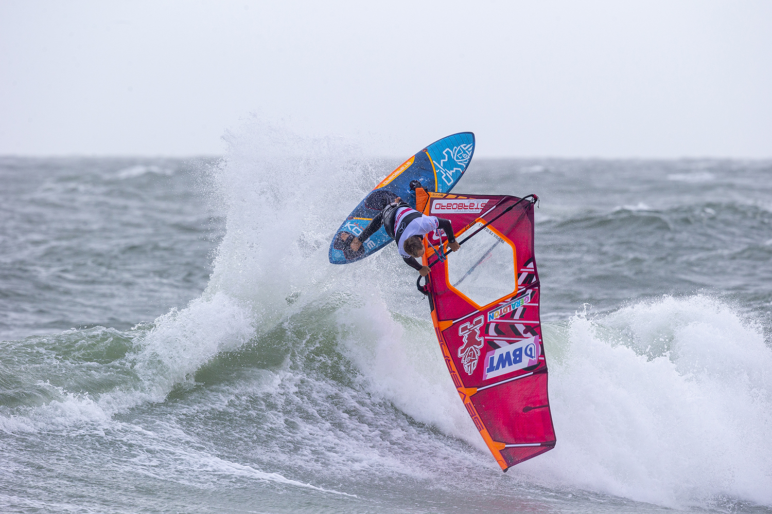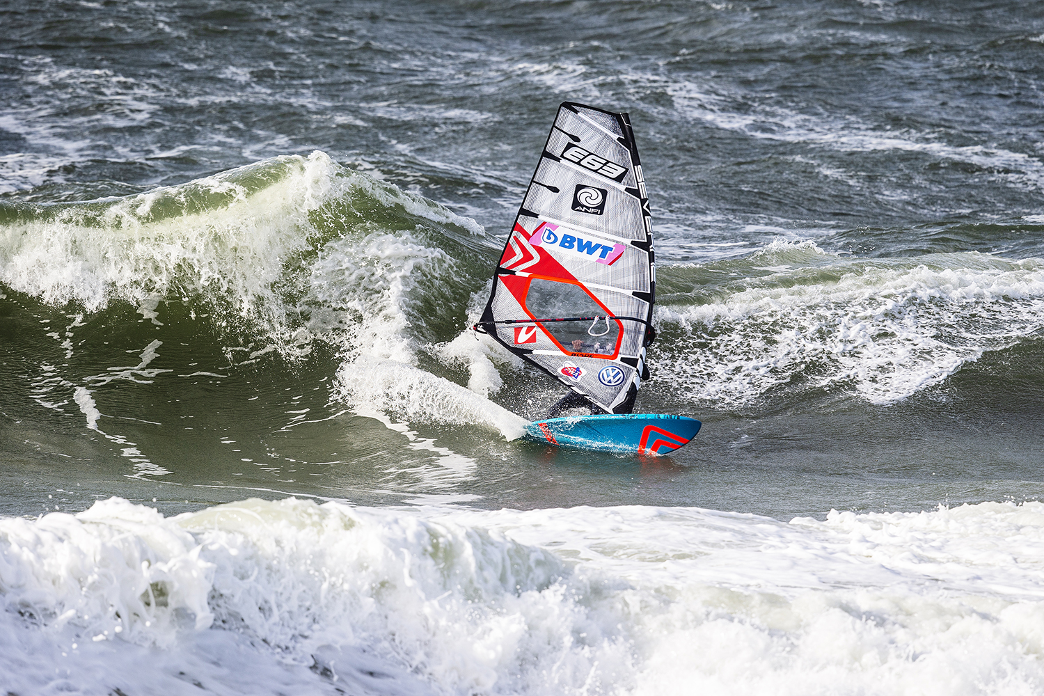 I am 1.78 m and 79 kg. In Sylt anything can happen. Every heat I had there was a big rain squall right before which totally killed the wind. I did not know whether to take small equipment or my big gear. During the rain squalls it was getting pretty windy and afterwards there could easily be next to nothing. You always have to go bigger than normal. In all the heats on the first day I was on a 94 litre board, which was ok with a 5.3. I just had no power to do anything. It was not a matter of the gear. How big can you go for a wave event? On the bolt onshore day it was windier so I took 4.7 and 5.0. I think my fins were 13 in the back and 9 in the front with a quad setup. The wind was so onshore and the inside is just whitewater foam. The wind hits the tent and bounces back to create a total no wind zone. Every time a sailor goes downwind, their wind is blocked. If you are lucky you make it out. Sometimes you have to go to the beach and walk or run back up. If you don’t clock up a high scoring wave and mess it up you can be done as you might not make it out. I did not feel it was fair, it was a matter of luck. Brawzinho had a great comeback to make it into second. I lost to Brawzino and just could not find the ramp to nail a double. He had a better advantage to me on the jumps, but I had better waves. It is what it is and there is nothing I can do.I was bummed I dropped some places on the overall rankings.