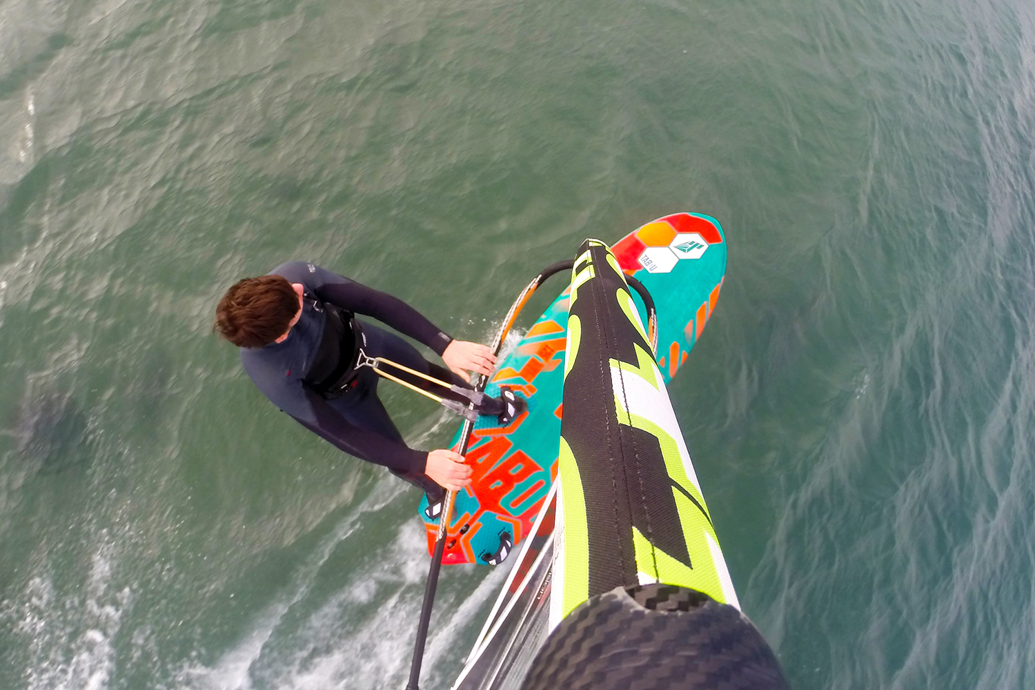 Used with its supplied fin initially, the Fifty feels compact and relatively small underfoot, but apply the pressure, drive it off the wind through the fin and it needs little more encouragement to release. The footstraps feel more outboard than most and take some good orientation to find; if less well versed there are inset placements to use. Once on the surface of the water and planing though, this thing is like dynamite! It accelerates feverishly and yearns for more power. It provides a high-octane ride and naturally lets the rider slip into a committed stance, their feet comfortably resting against the ergonomic rail shape and driving hard against the fin. Partnered with an efficient sail, it is fast on all points of sail, but particularly off the wind, skipping over the back of chop, whilst retaining its compact, comfortable and dependable nature – impressive for a board of its tail width. That said, unlike a slalom board, if the conditions become too challenging, the Fifty does allow the rider to stand up and ease out, settling it down and sailing at half speed. It provides the time and manners for you to gather your breath, before engaging again and going for another glory run. In the gybe, the Fifty goes require some guidance and rider input, particularly when fully lit and in corrugated seas. Pick your spot and enter with speed and commitment though and it will provide the just rewards – it grips like there is no tomorrow and will throw you out of the turn with interest. Perhaps a little unnerving for the progressing intermediate, it will command the more experienced rider’s attention and keep them coming back for more. And as for its foiling credentials, the Fifty is a born flier! High aspect, low aspect – it can partner them all. We did find it flew nose down with a few, so if the foil has a tail-shim trimming option, all the better. If not, play with the base plate position before the footstrap options until comfortable.