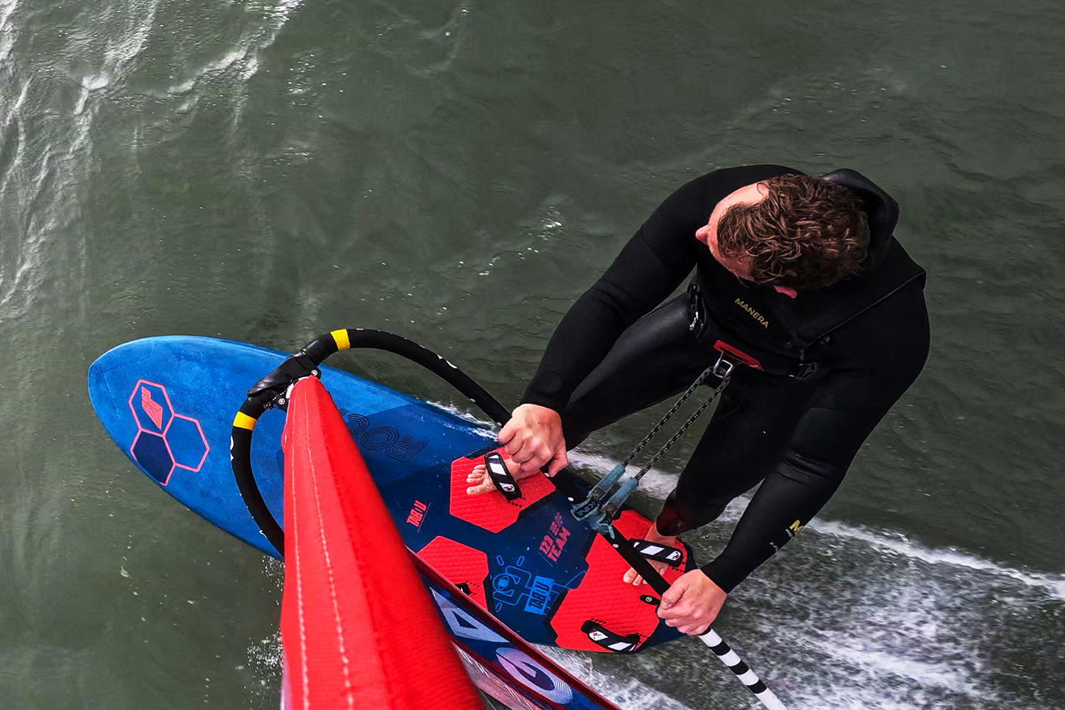 The Rocket Plus is available in three constructions – MTE, LTD, and their premium construction; TEAM – which we were provided with for the test. Out of the box, the Rocket Plus feels light, and it is generally thinner than others – particularly forward of the mast track. Most of the volume is placed from the hips back, but it still holds a thinner profile. The Rocket Plus may feature less footstrap settings than some others, but the options available to you place you exactly where you need to be to make the most of its outstanding potential. Its deck pads are thin and will keep you in tune with the Rocket Plus, keeping it lively and reactive to the input you choose to give it. It does possess a slightly wider stance, bringing the rider a little lower to help manage larger, well-powered rigs. Its tail remains wide, and when rolling the board over, the Rocket Plus carries one of the more interesting and engineered tail designs, with racy cut-outs to reduce its wetted surface. The cut-outs undercut where the rear straps are placed, keeping the rider outboard and driving the rail, while still keeping resistance to a minimum. With a relatively flat overall rocker profile, its nose does kick up substantially to keep you out of trouble in messy waters. Without even hitting the water, the Rocket Plus carries a personality that screams performance. Add in its angular shades of blue on the deck, brushed carbon finish, and rich red pads and detailing, and it certainly looks the part…