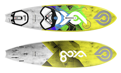 “Over the years we have encouraged everybody to get into bigger board sizes. This new line is our response to the very demand we have pioneered. Fresh tail shapes evolve through the line, starting with smaller crescent tails, growing in width into the middle of the range and turning into squash tails for the two big shapes. Standing only 6” from the tail creates a geometry that allows you to ride the Custom like a surfboard. Shorter outlines, straighter stance rails and narrower tails define the dynamic of these sticks. Concaves run throughout the bottom in ever changing geometry, allowing you to accelerate toward the pocket with no resistance.”
