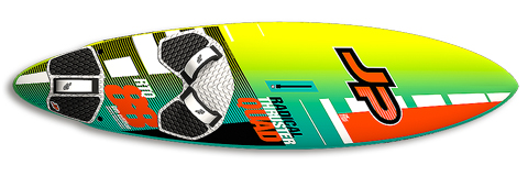 JP’s Radical Thruster Quad series was introduced in 2016, adapted from its predecessor, the Radical Quad, by adding a central finbox to each size in the range. In addition, the 88 was introduced into the line-up and along with its four other siblings, remains current for 2017. Available solely in Pro Edition construction, using S-Glass technology with stringers and carbon rails incorporated, what is new for this season is the fact that each board is supplied with resin transfer moulded (RTM) fins – increasing performance by reducing weight. At face value, the most standout design feature of the 88 is its wingered rear – wide in front of the rear strap (intended to provide more surface area and early planing), leading to a super narrow and thin tail for “radical turns”. There are also some deep concaves in the hull of the RTQ, most pronounced under the straps, where the raised central vee helps to create a long flat planing section through the middle of the board. Supplied with JP’s tried and tested straps and 10mm dual density deckpads, it certainly looks the part, dressed in its bright eye-catching livery.