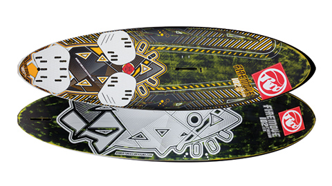 “The Firemove concept is based on an oversized middle width, an extra reduced volume thickness and rail shape, combined with a very long flat section scoop rocker line. An impossible combination for most at first, a real innovation for all after testing this magic breed of board shapes … The wide body of these new shapes allows better planing capacity by keeping a relatively short compact shape. Rig a wave sail and you can still plane quickly and manoeuvre like on a freestyle wave board, use a freeride or a two cam sail, and off you go. Full blast at top speed, keeping the same track of those freeriders around you.”